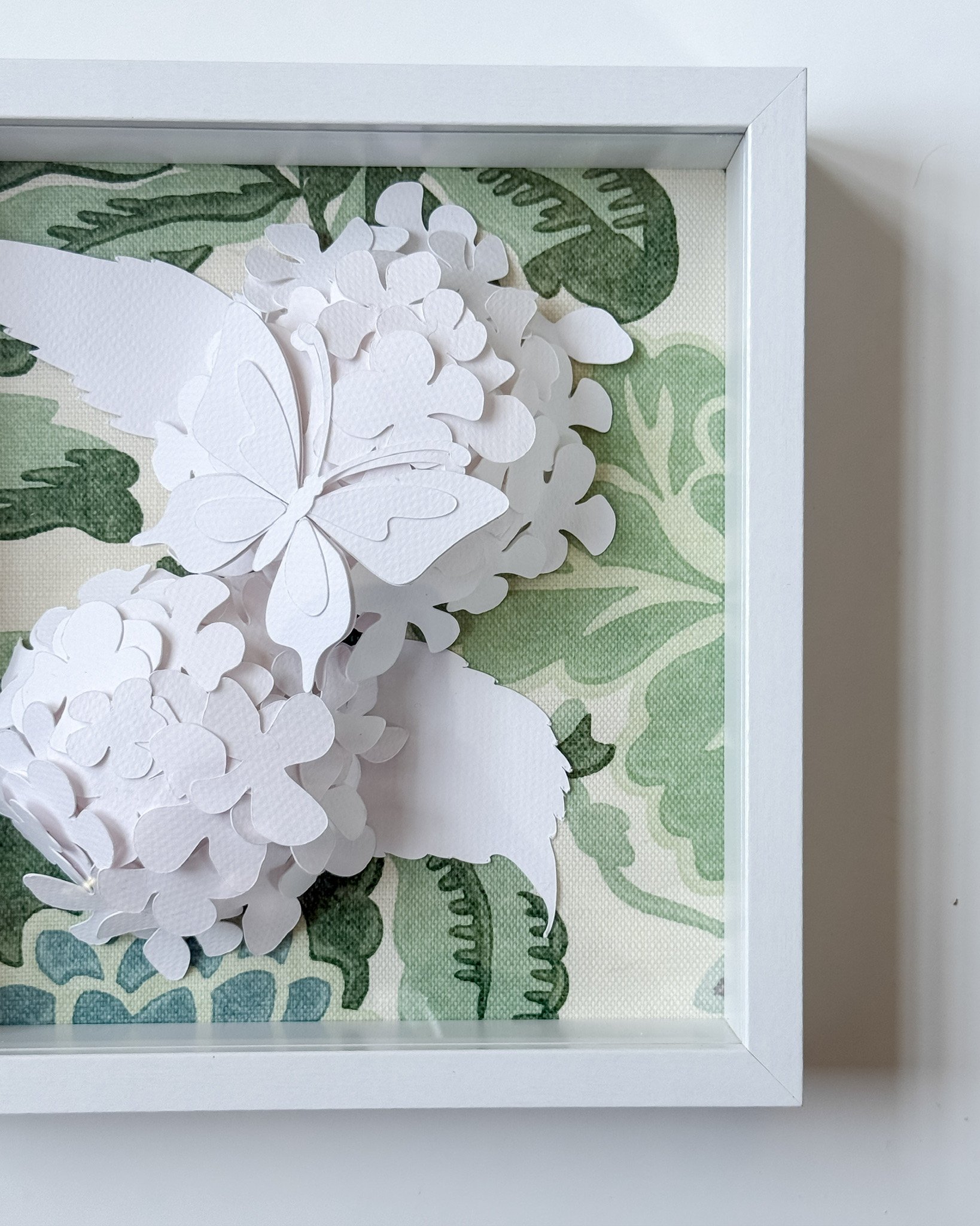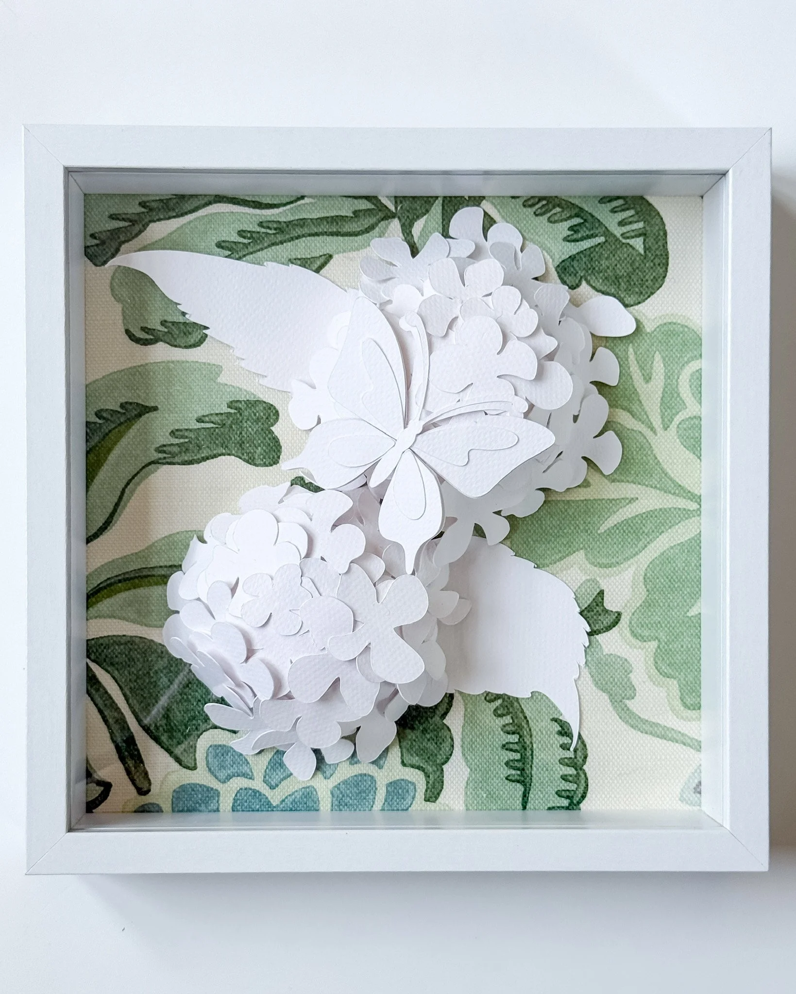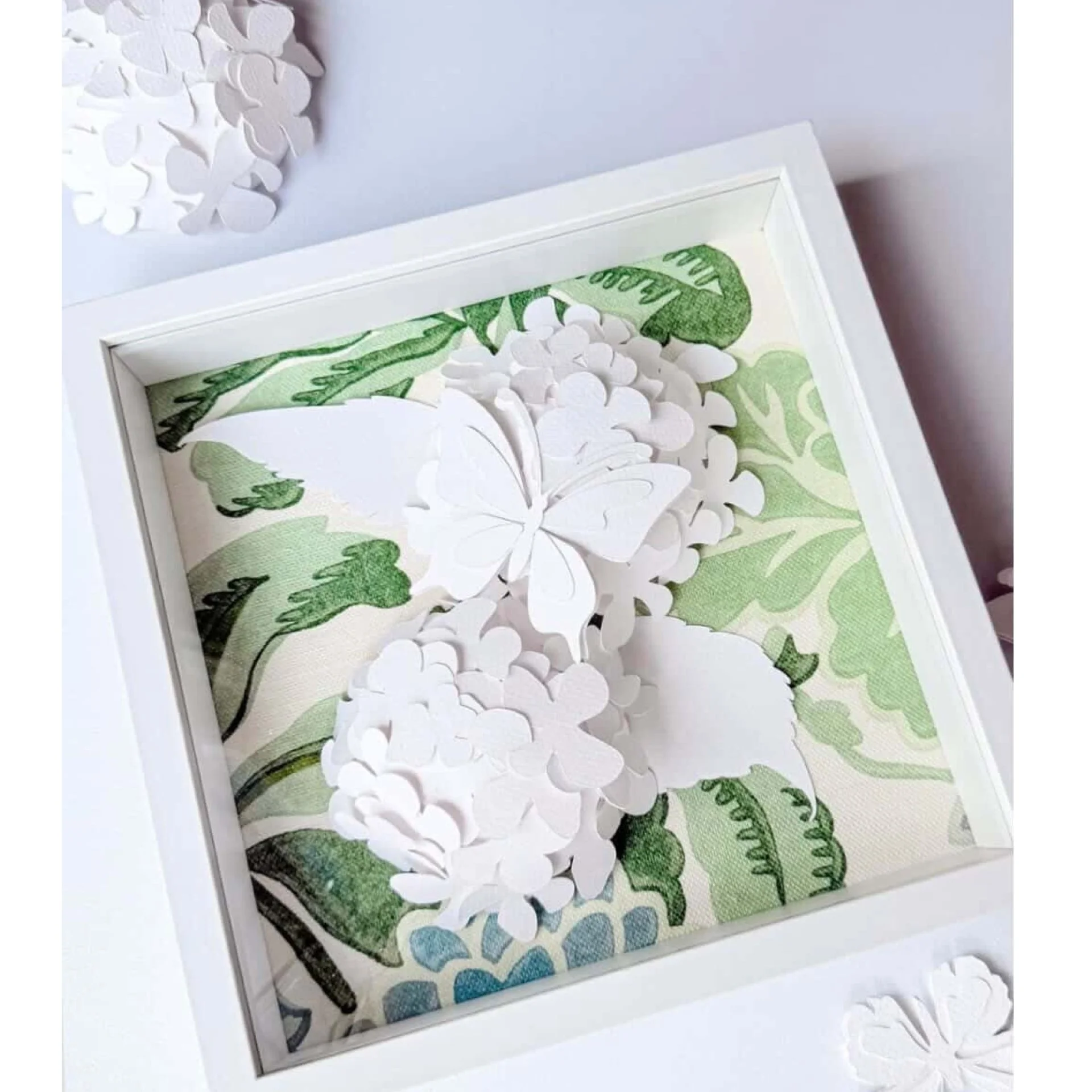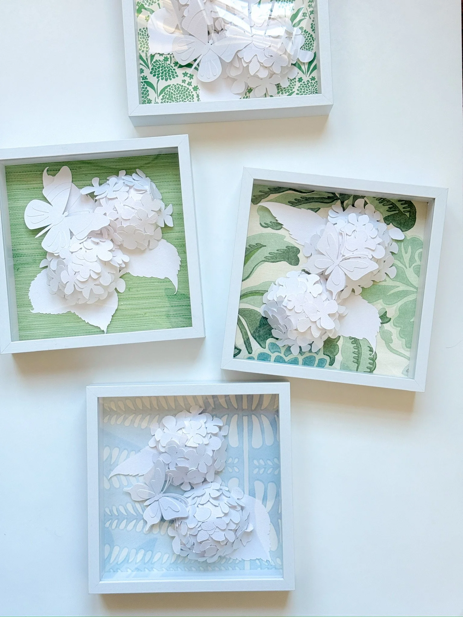 Hand-cut paper hydrangeas layered in shadow boxes over wallpaper backgrounds. Shadowbox can be displayed tabletop or hang.