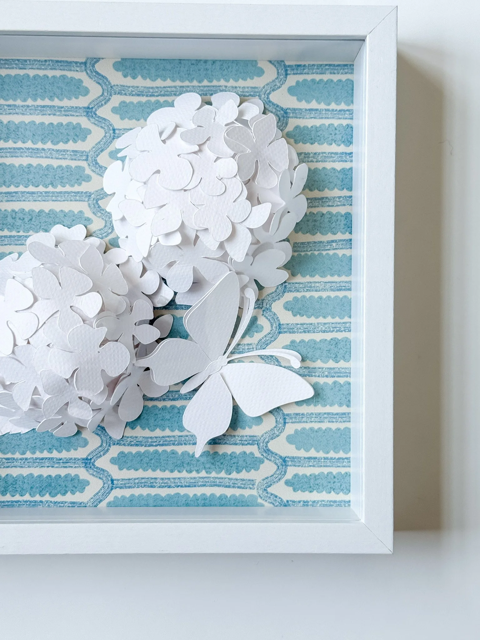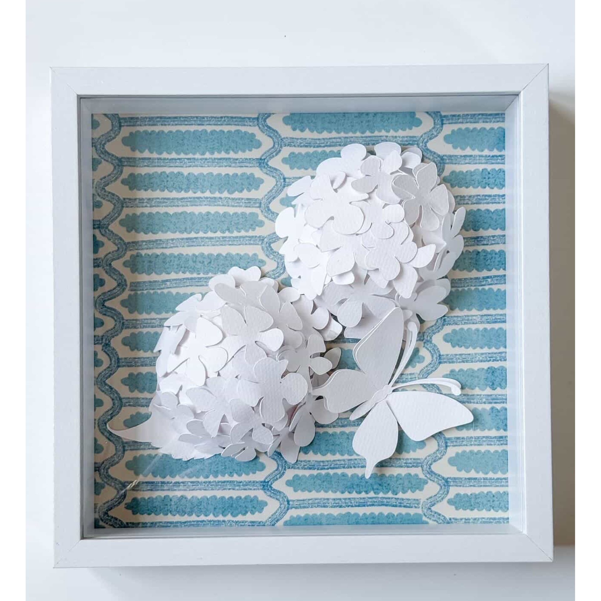 Hand-cut paper hydrangeas layered in shadow boxes over wallpaper backgrounds. Shadowbox can be displayed tabletop or hang.
