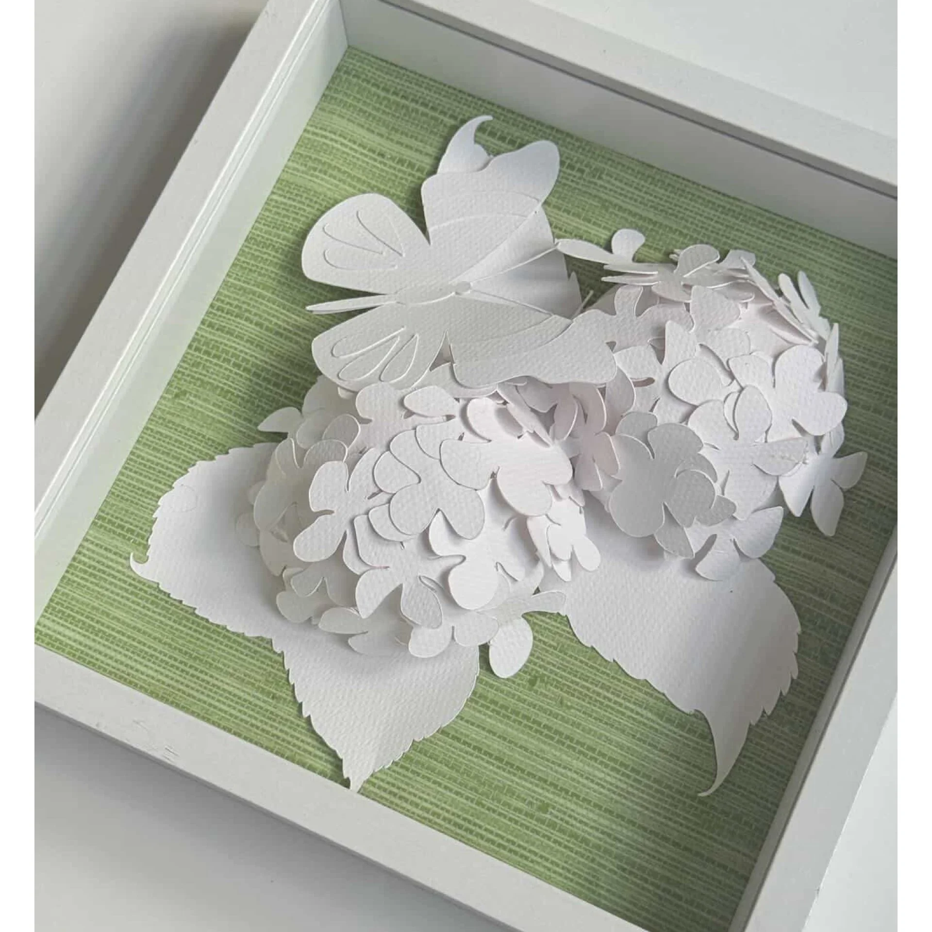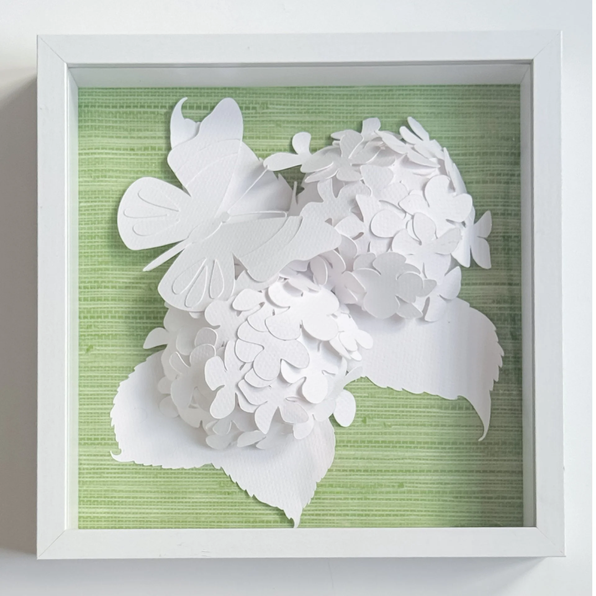 Hand-cut paper hydrangeas layered in shadow boxes over wallpaper backgrounds. Shadowbox can be displayed tabletop or hang.