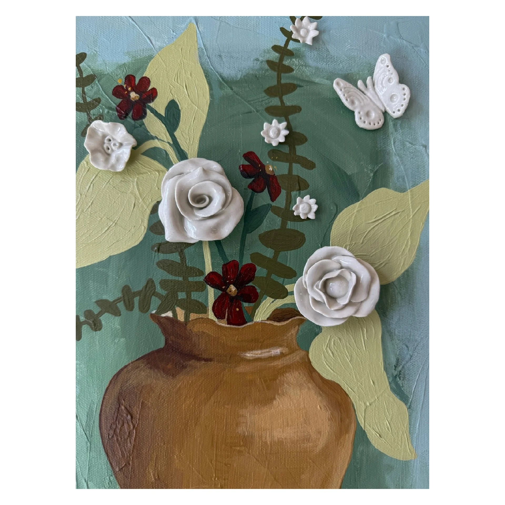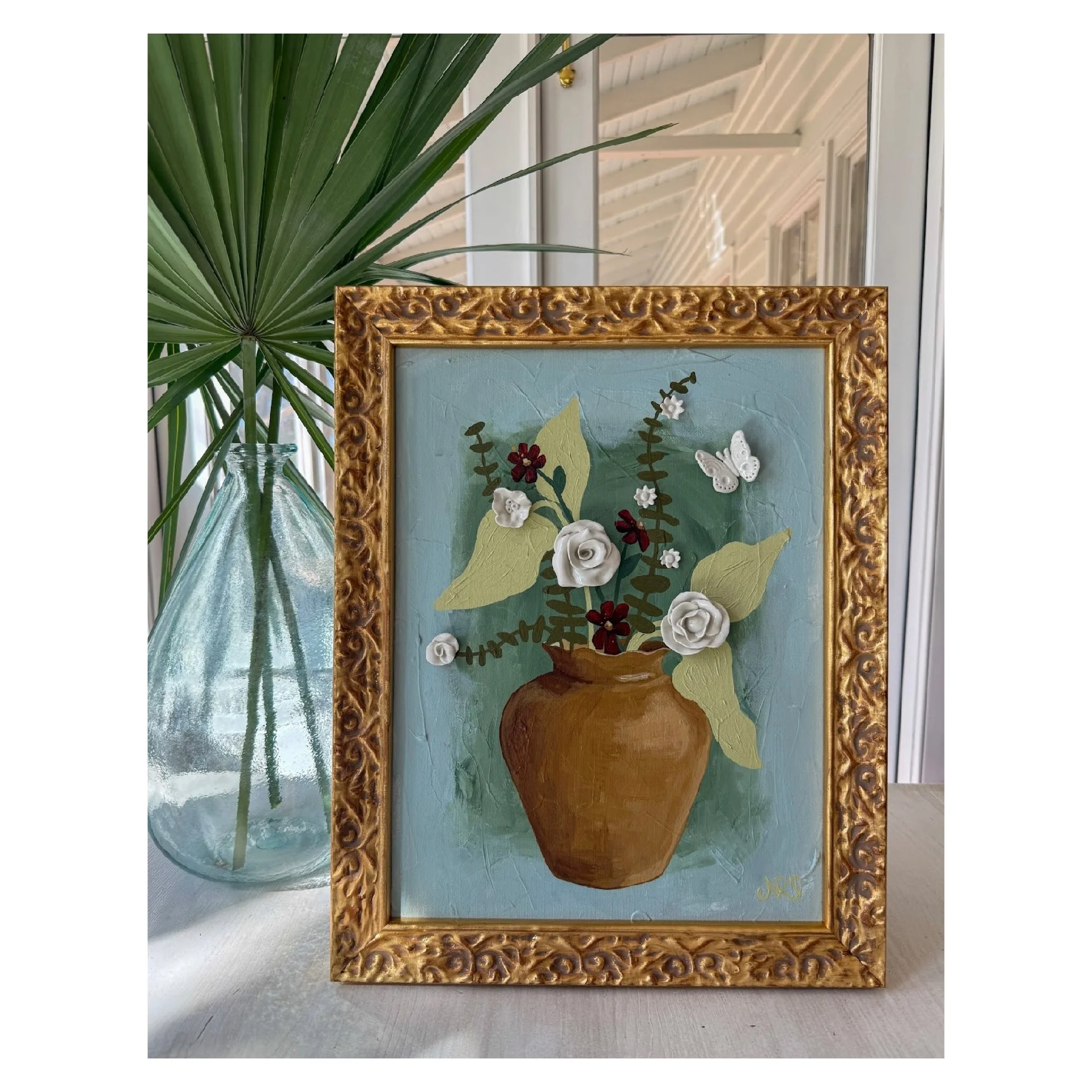 Porcelain and acrylic on canvas in an ornate gold wood frame.