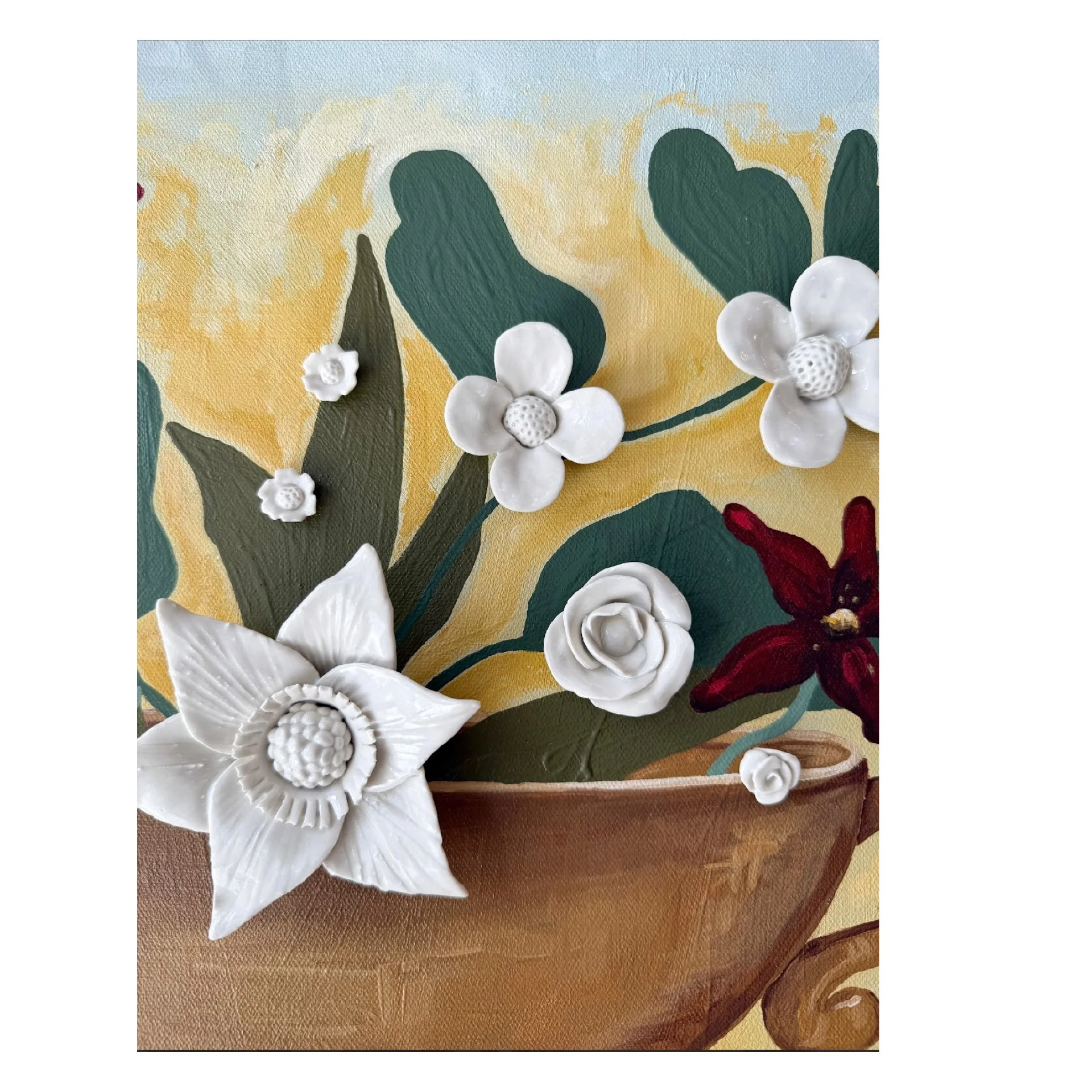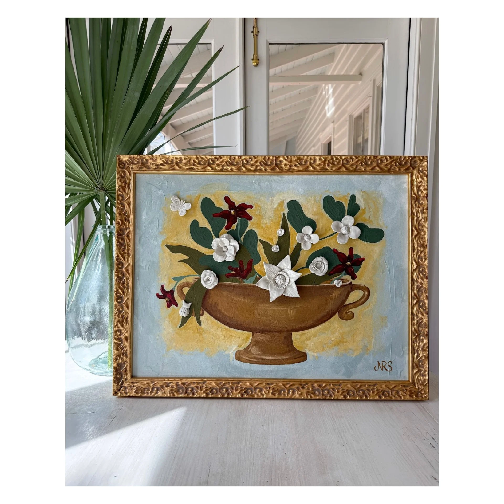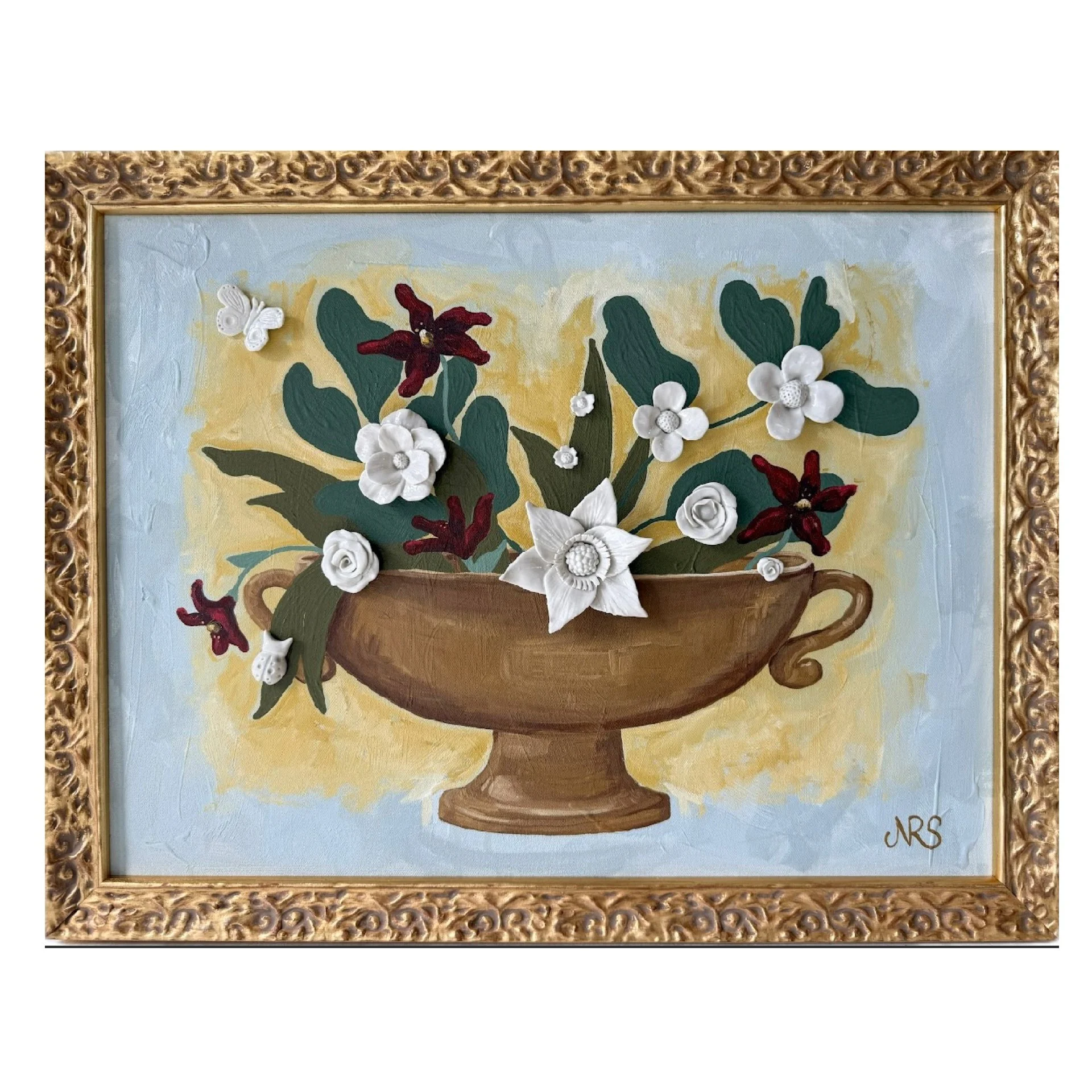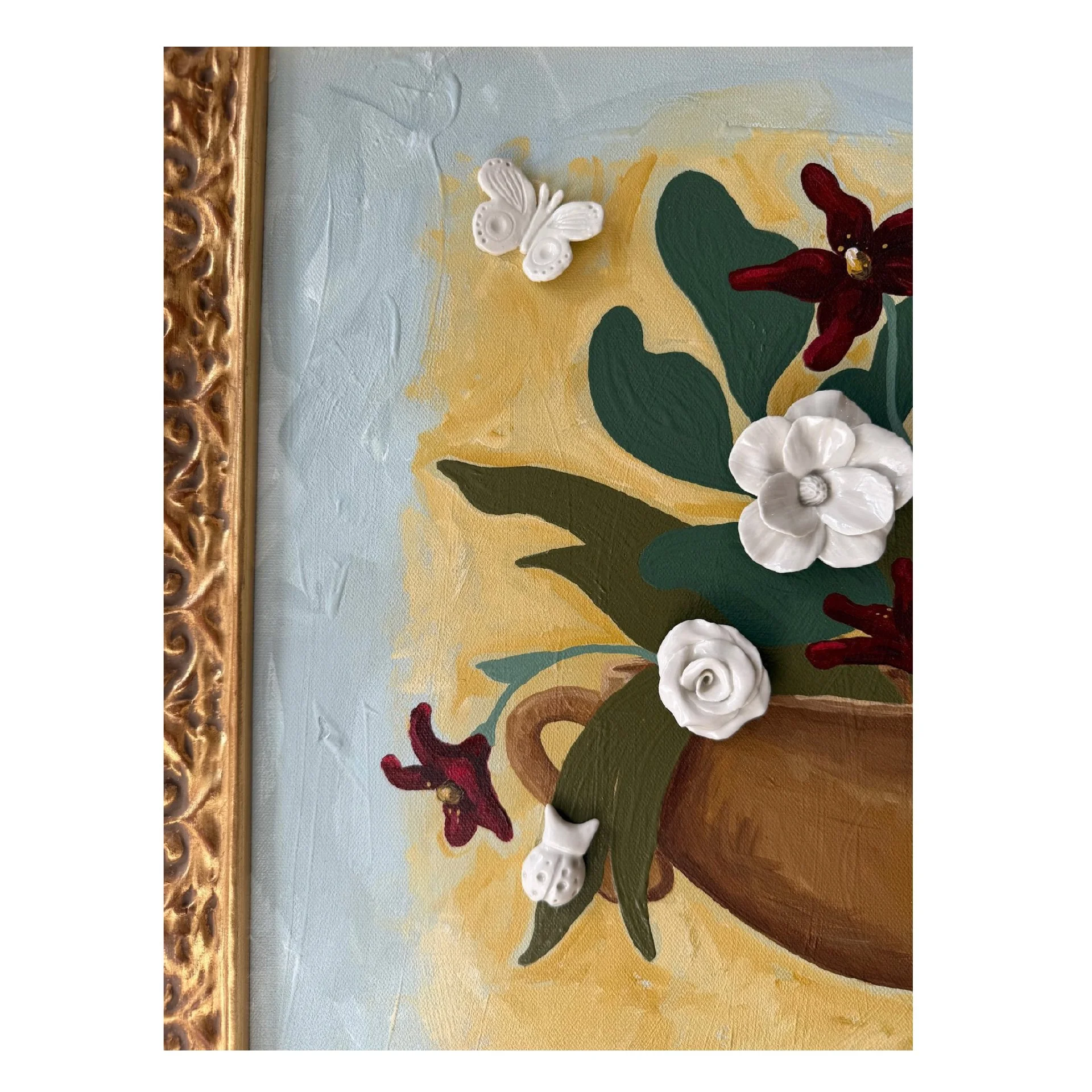 Porcelain and acrylic on canvas in an ornate gold wood frame.