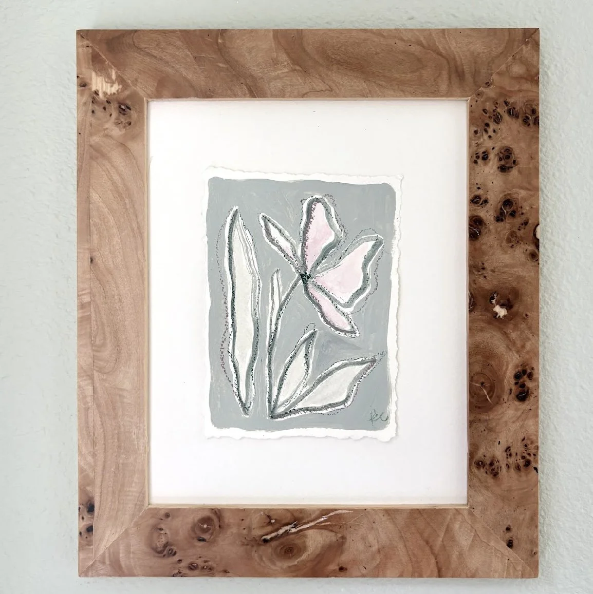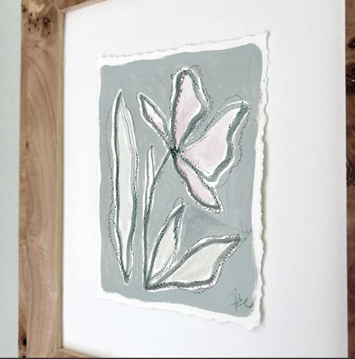 5 x 7 inch original artwork on hand torn paper. Floating in a burlwood frame.