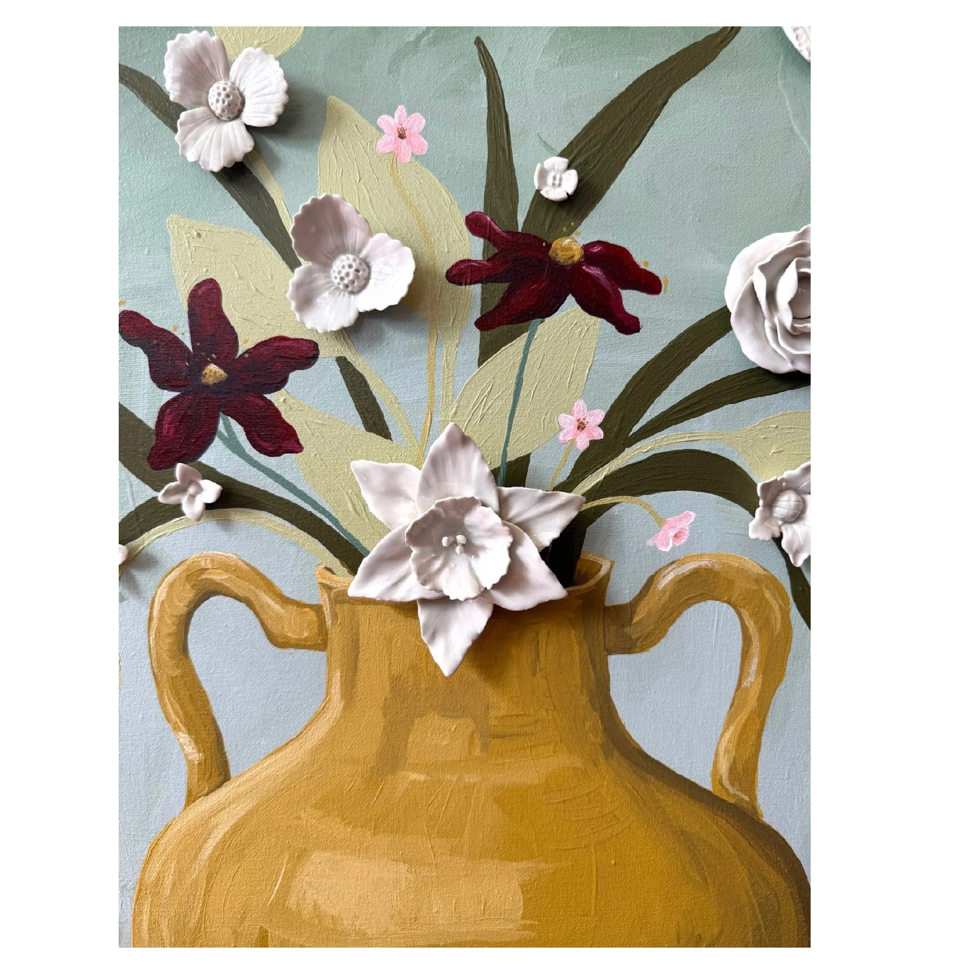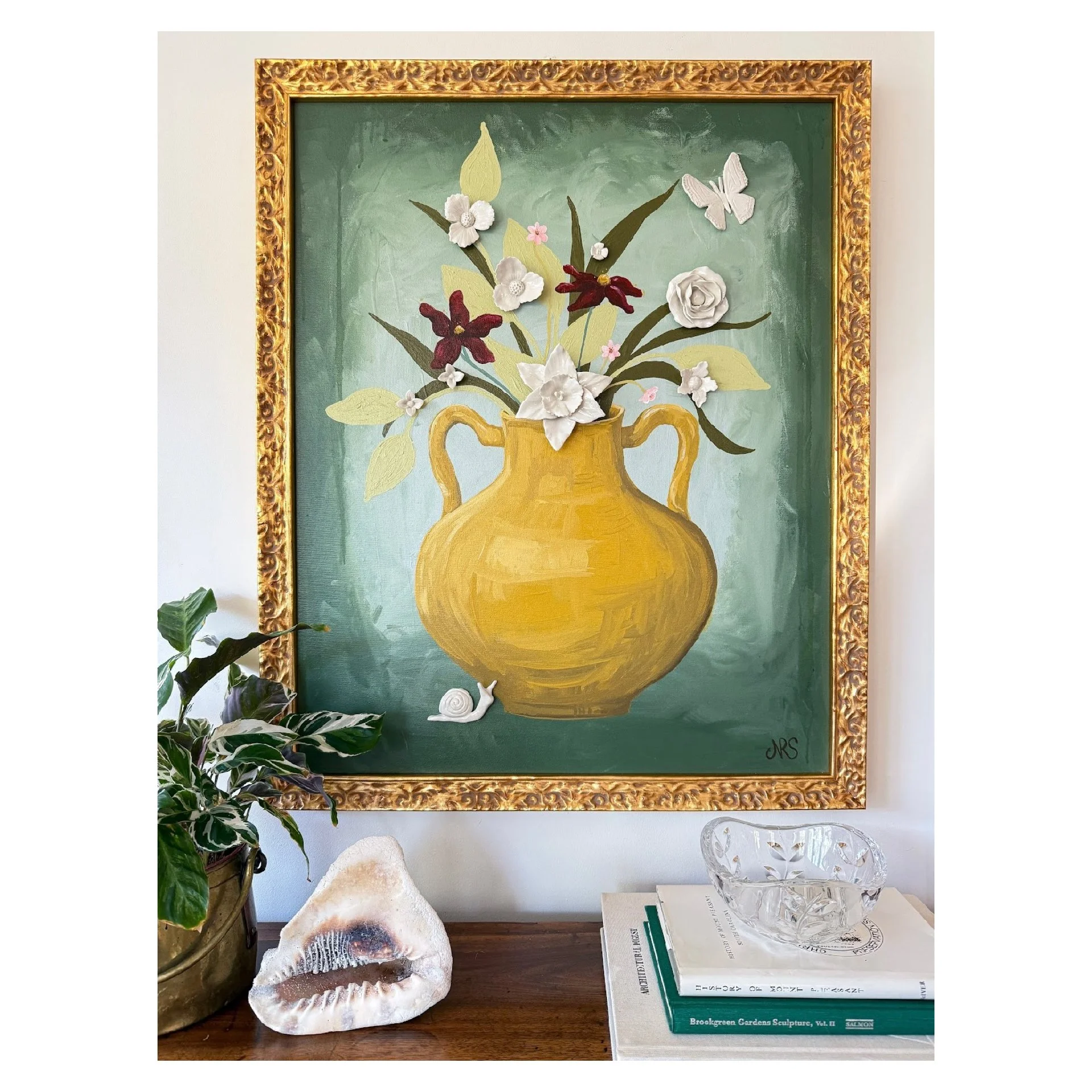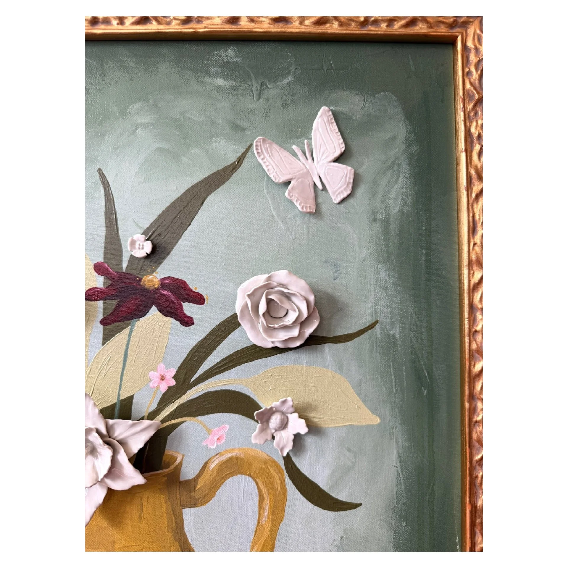 Porcelain and acrylic on canvas in an ornate gold wood frame.