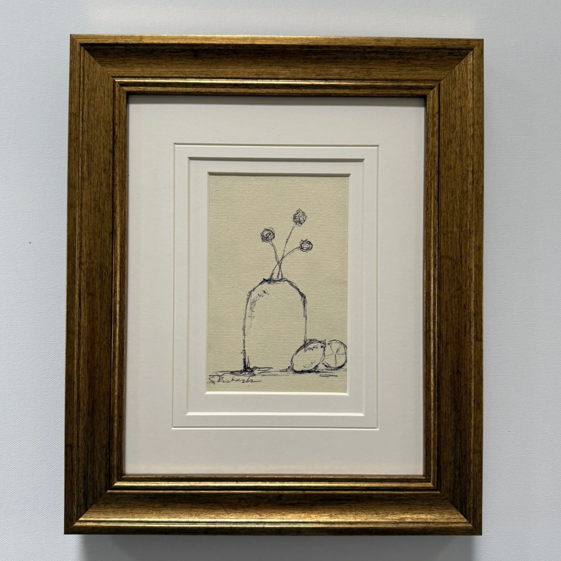 Ink on handmade paper from the base of the Himalayas 4 x 6 inches in size mounted to 8 x 10 inch paper. Can be purchased matted or matted and framed.
