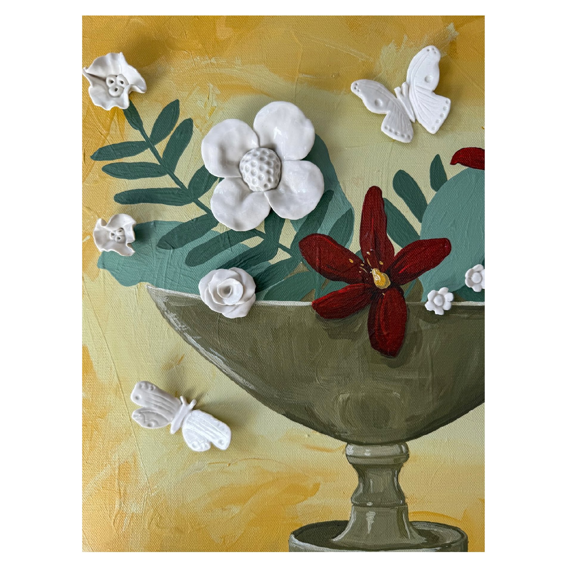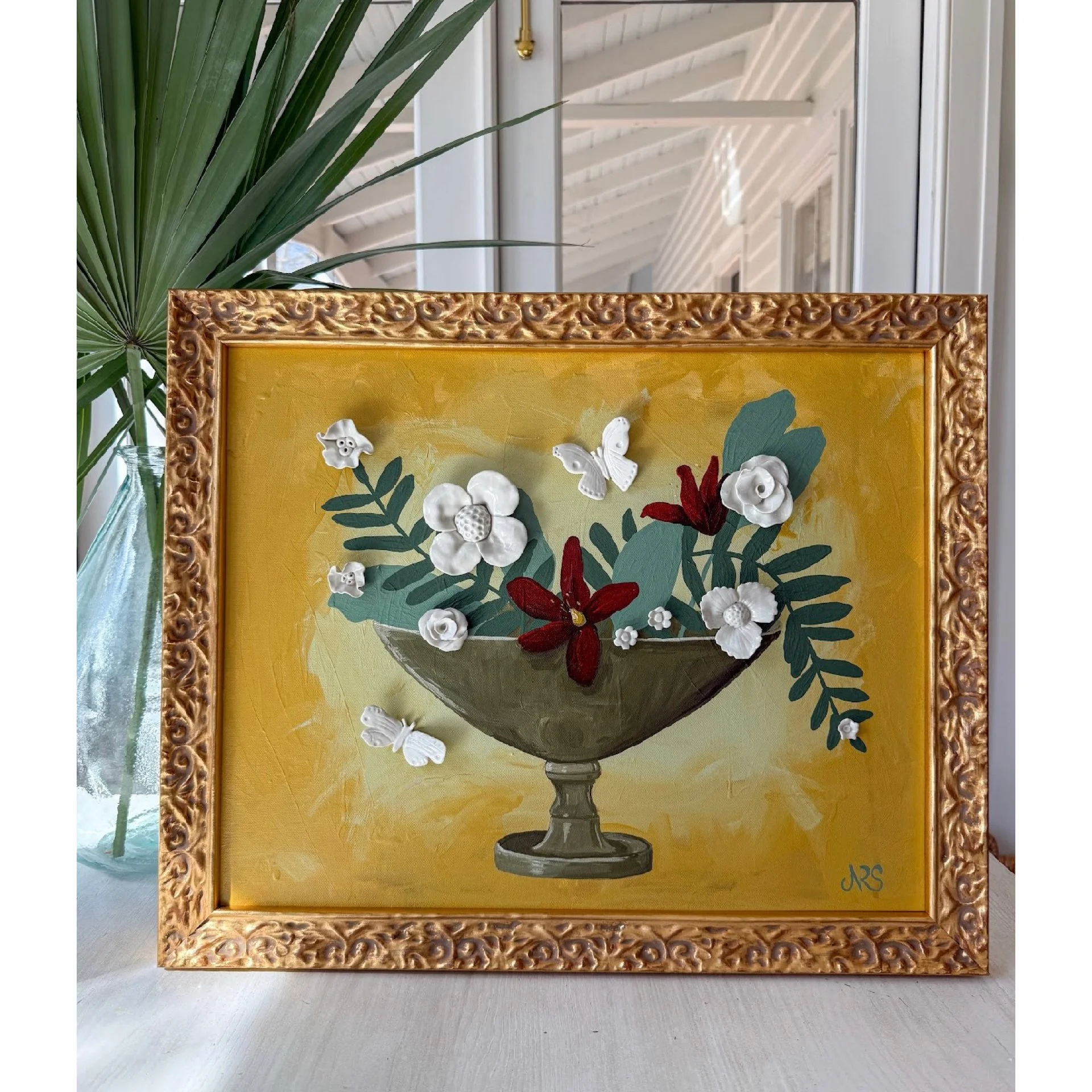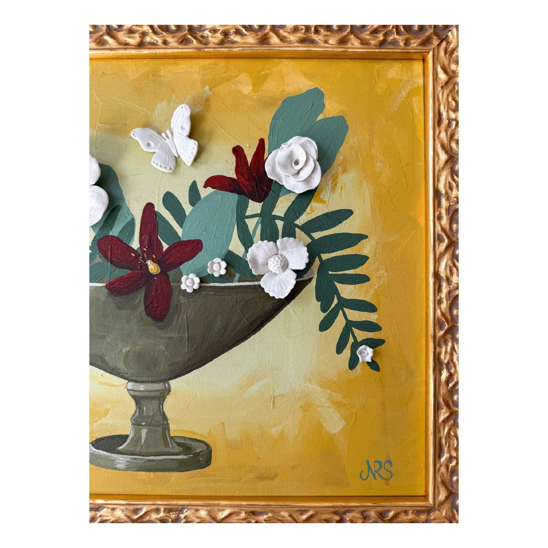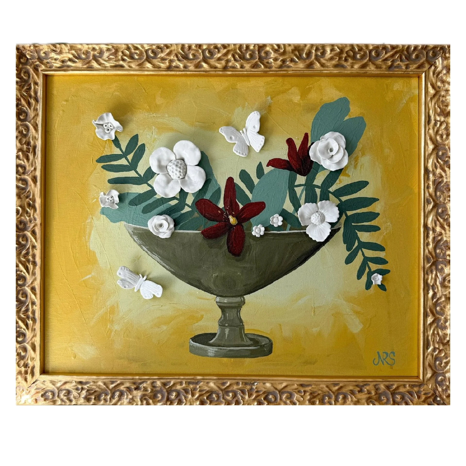Porcelain and acrylic on canvas in an ornate gold wood frame.