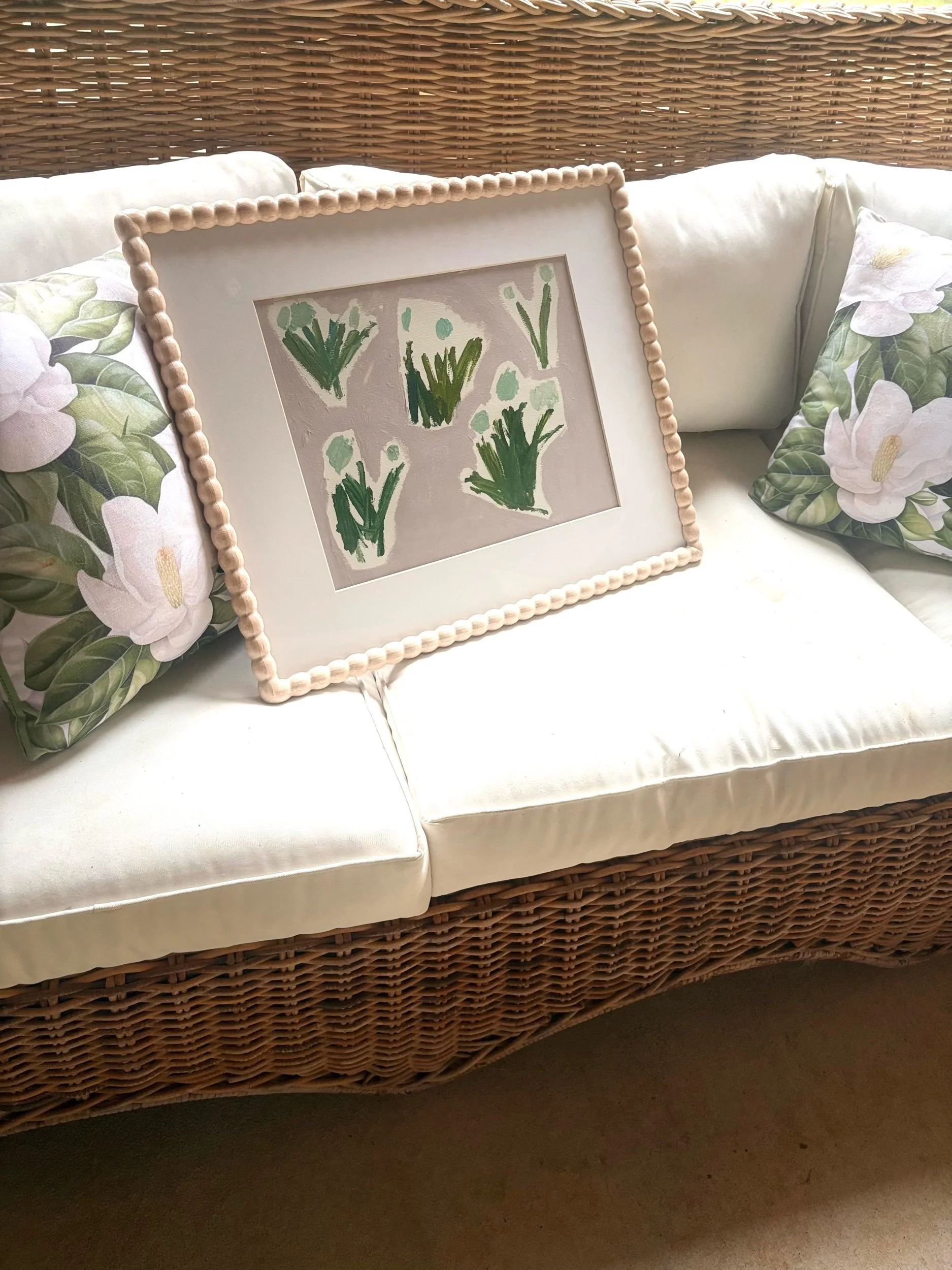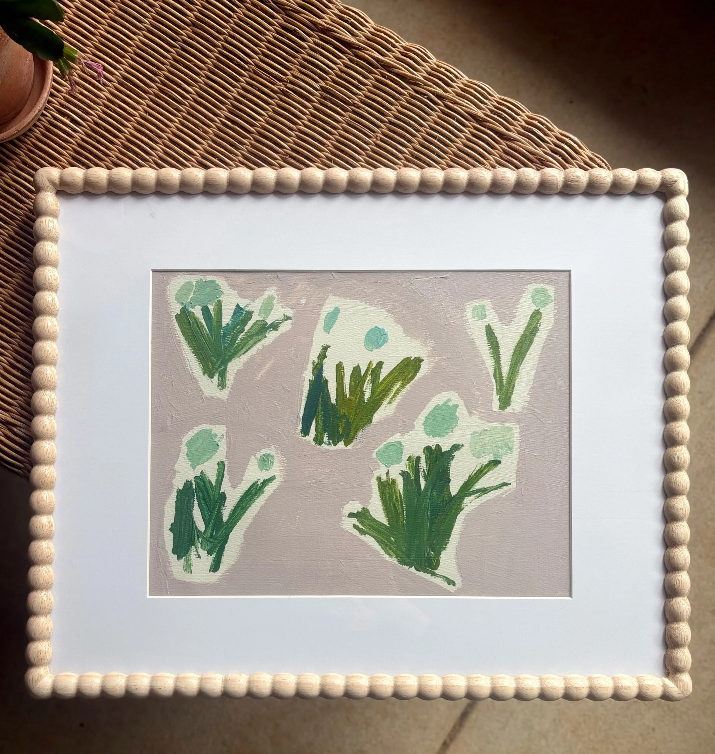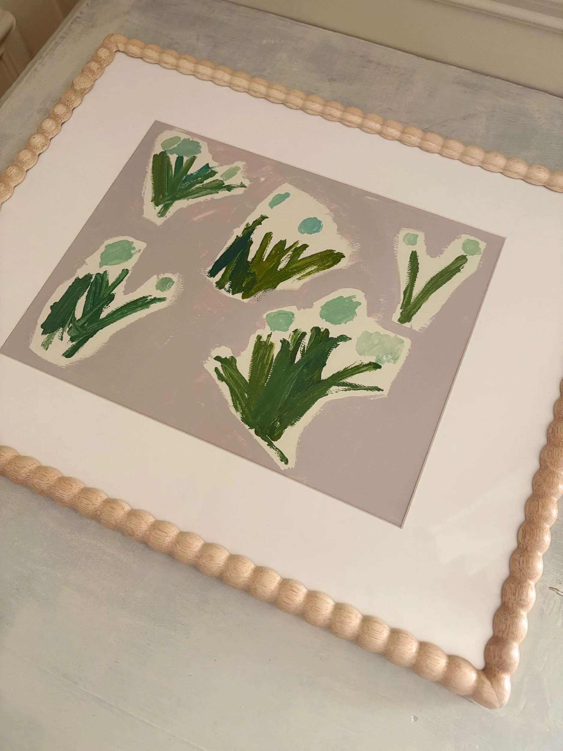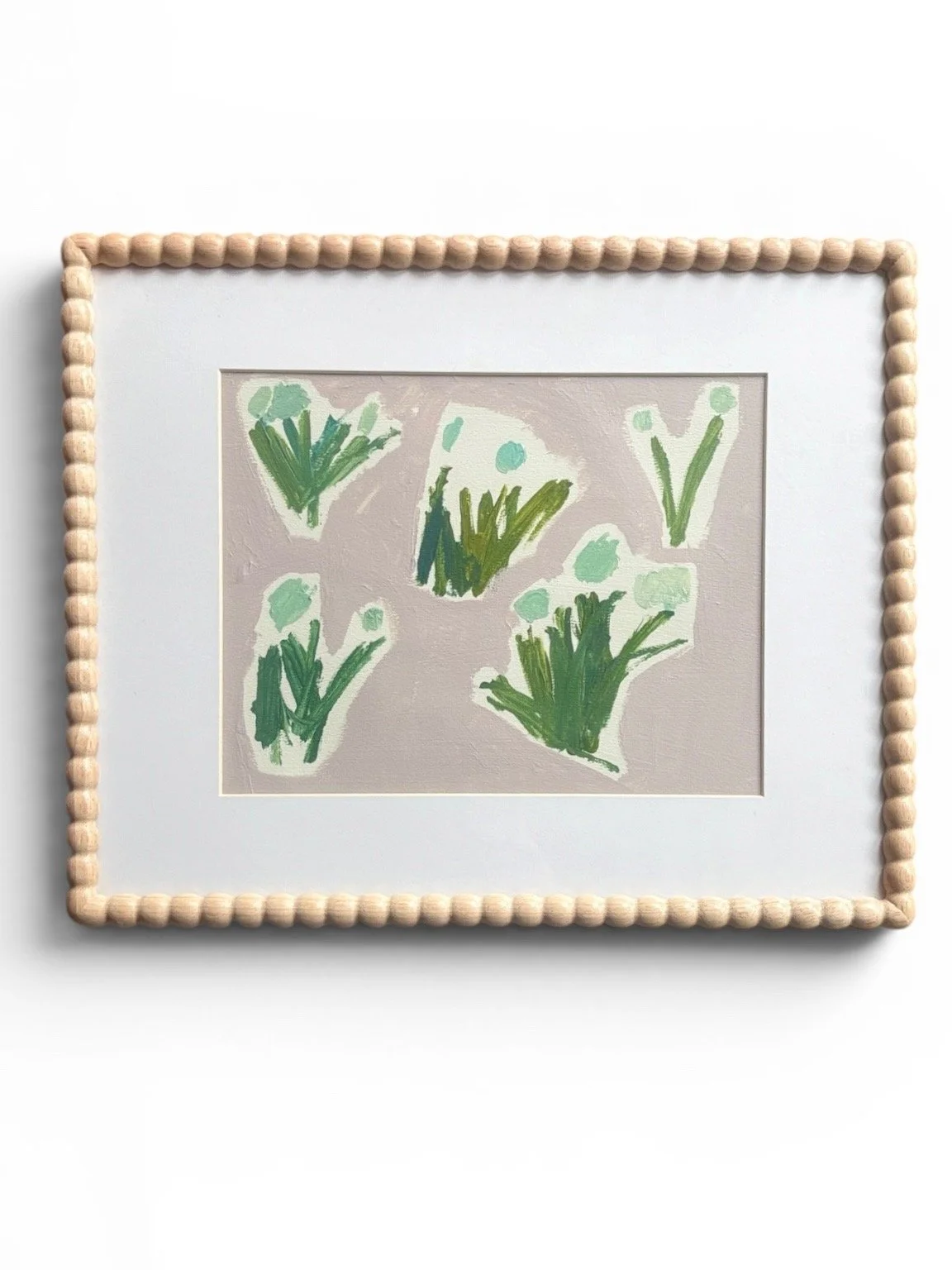 Acrylic on watercolor paper, wood frame, glass front.
