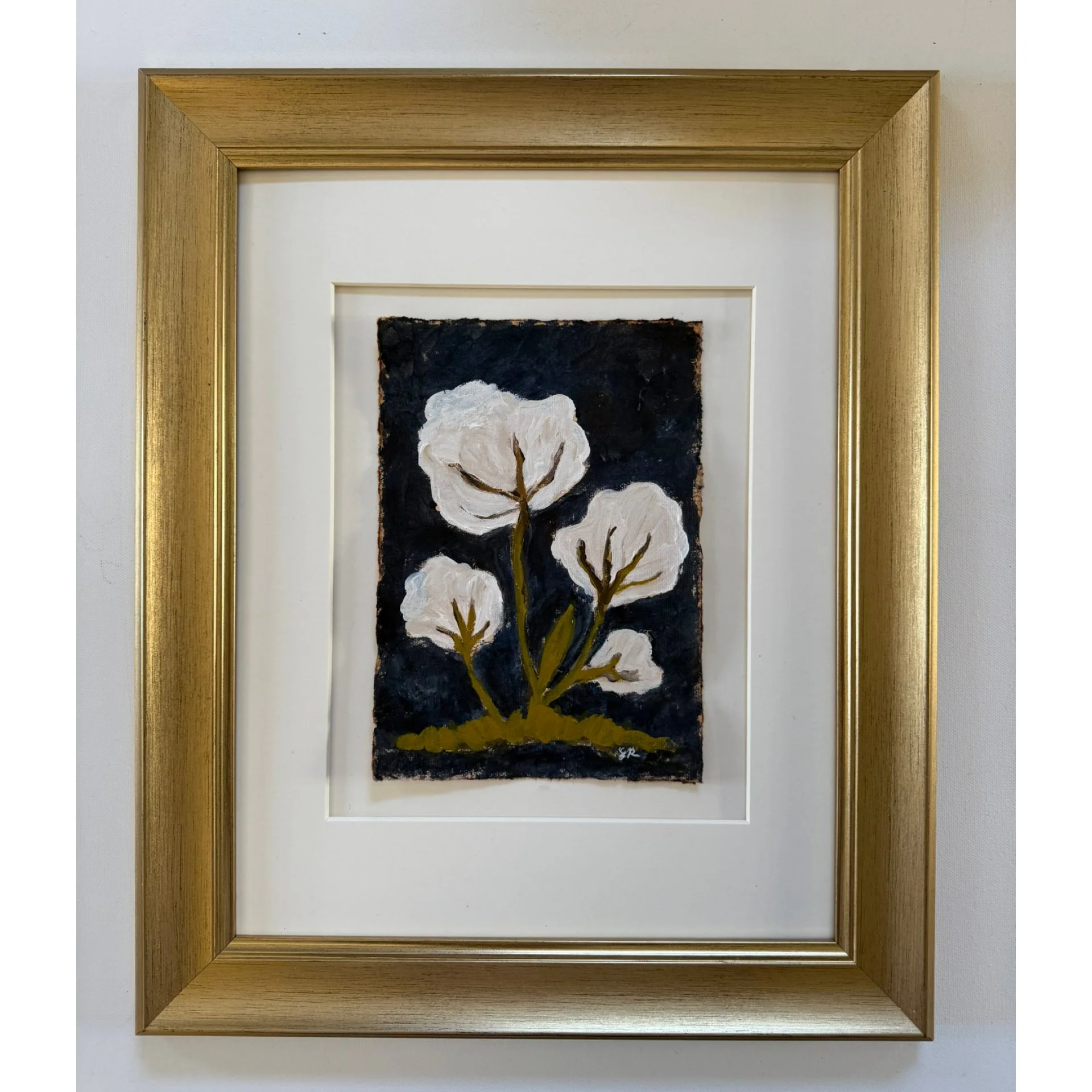 Mixed media paper with deckled edges 6 x 8 inches in size. Deep navy background. Can be purchased matted or matted and framed.