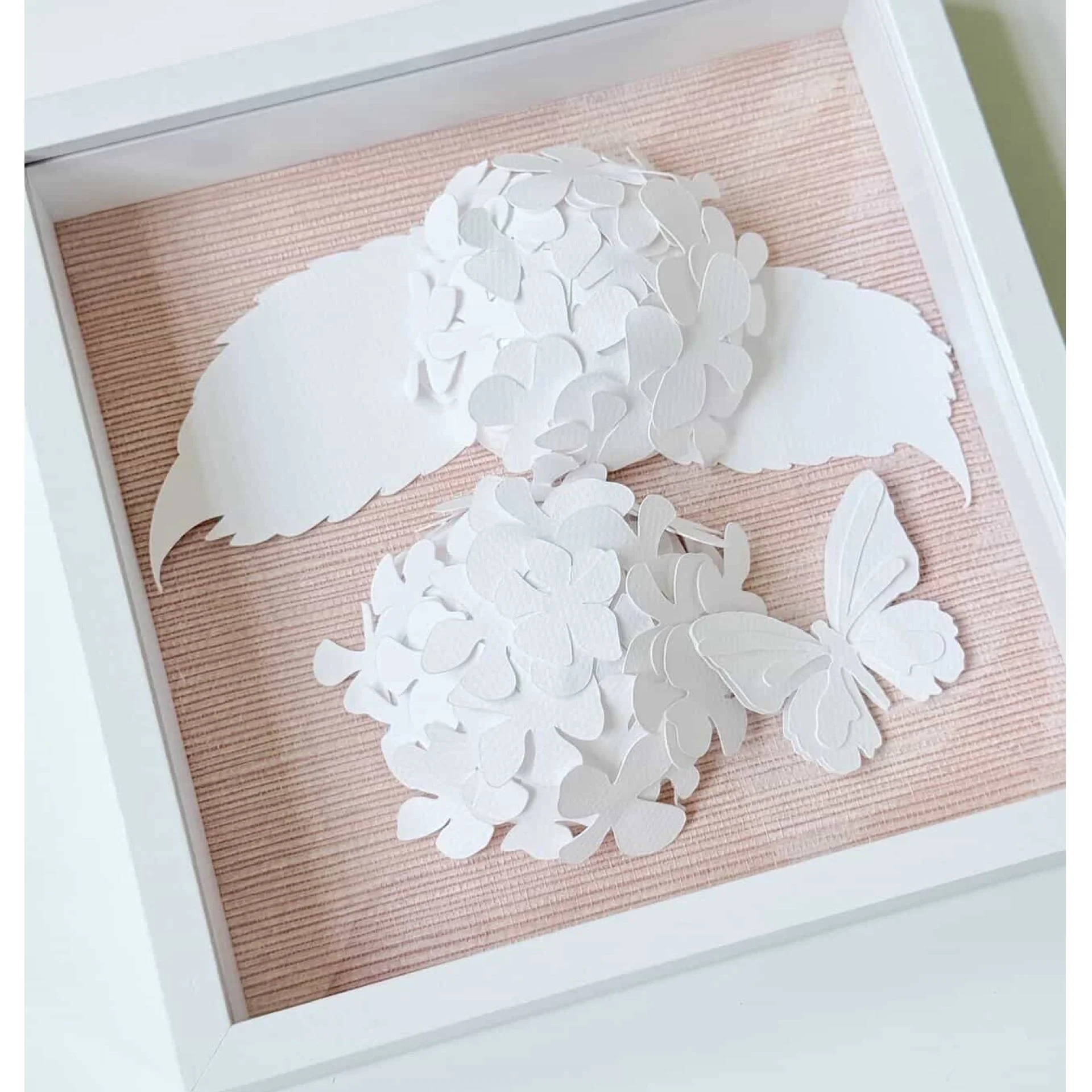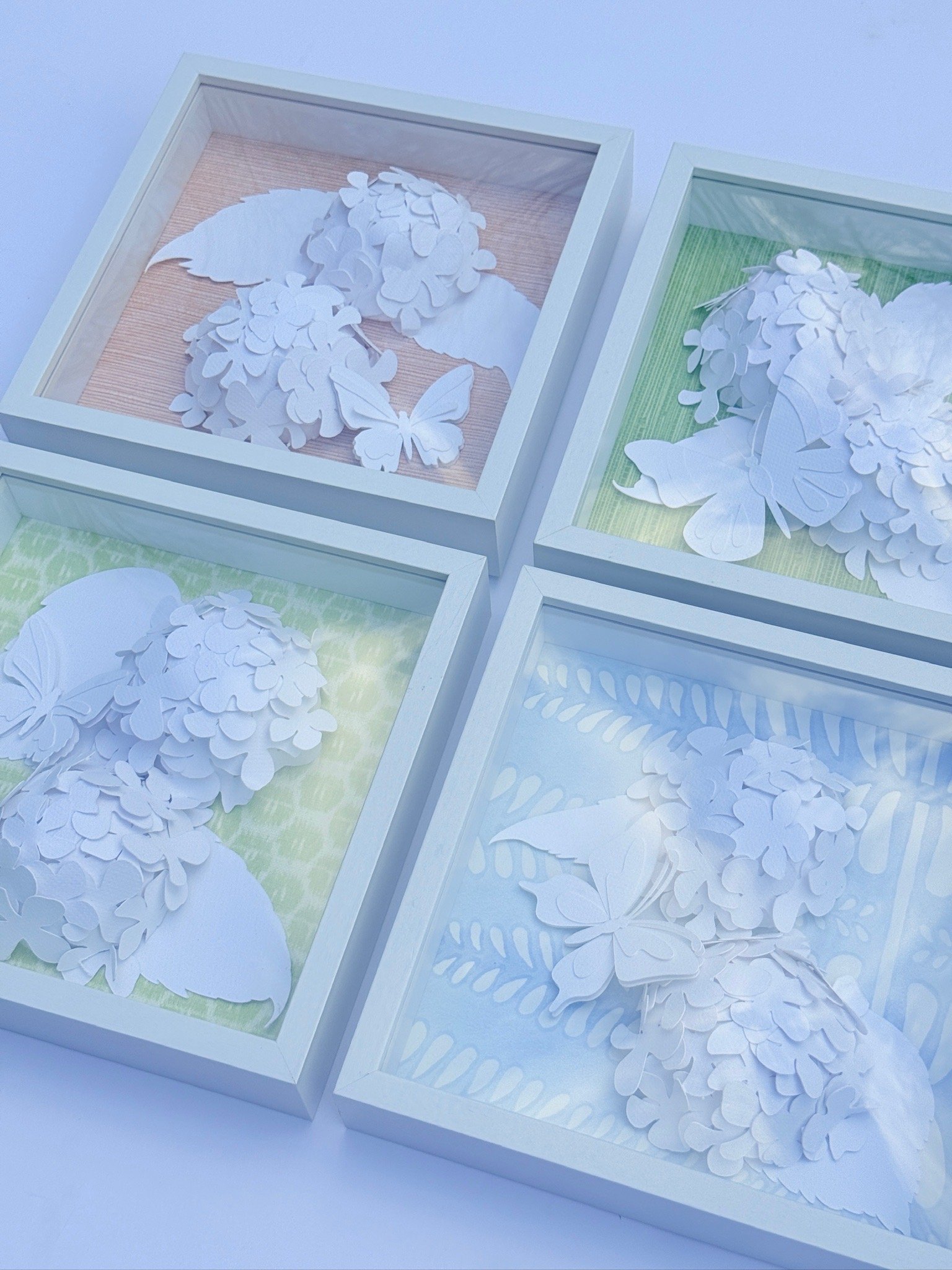 Hand-cut paper hydrangeas layered in shadow boxes over wallpaper backgrounds. Shadowbox can be displayed tabletop or hang.