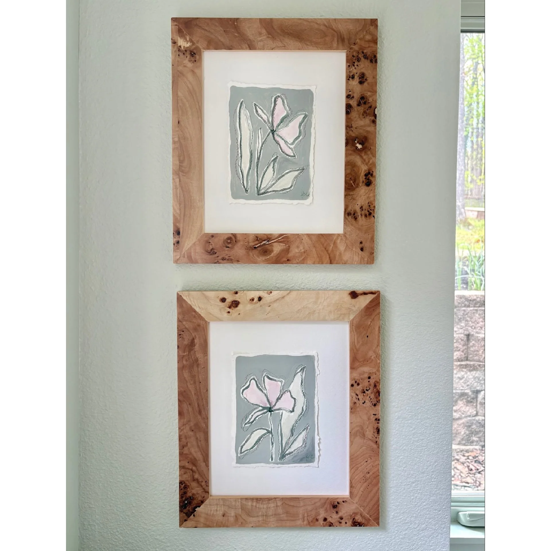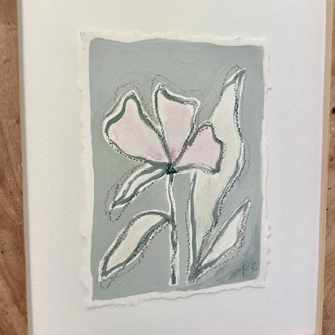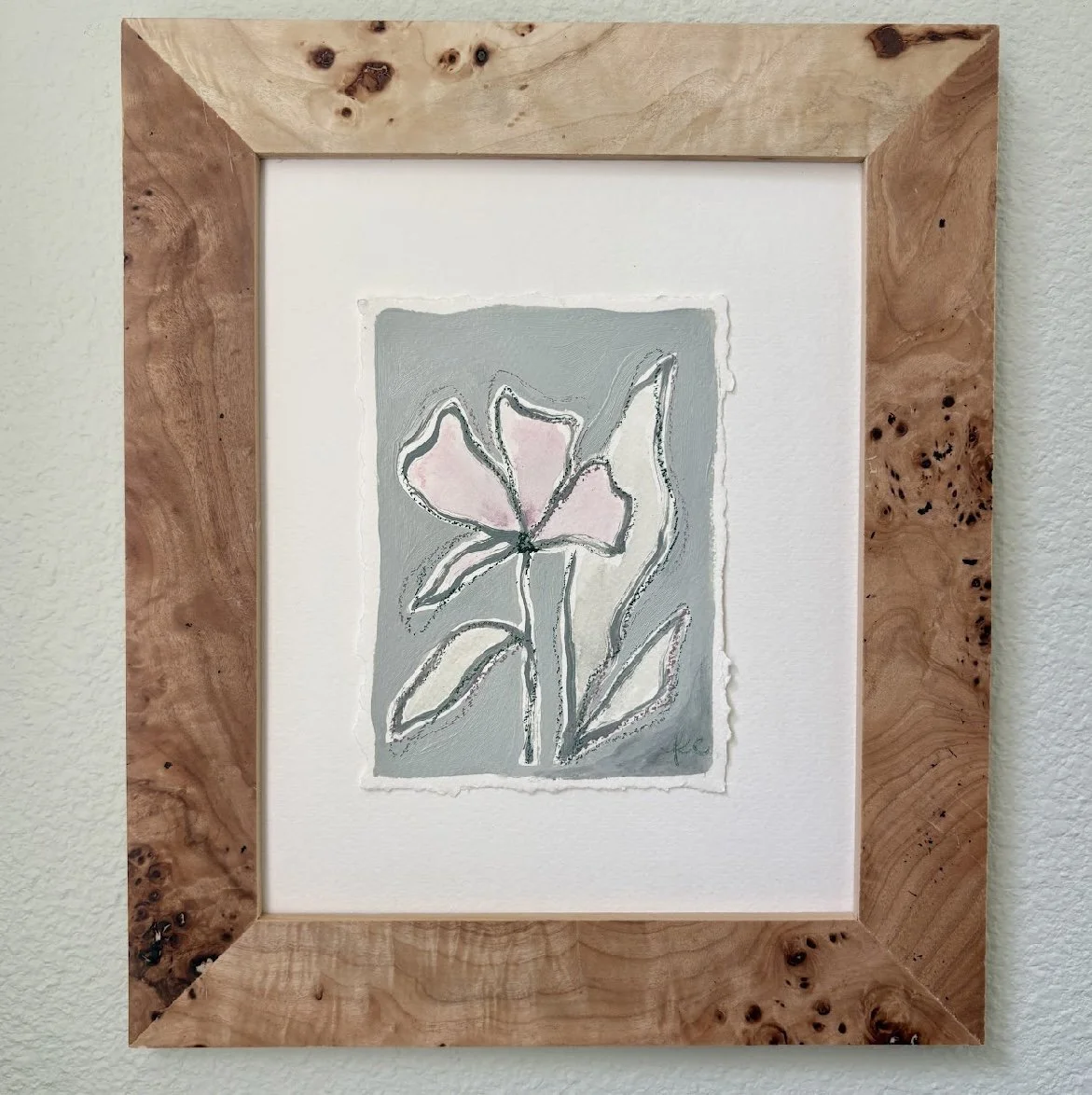 5 x 7 inch original artwork on hand torn paper. Floating in a burlwood frame.