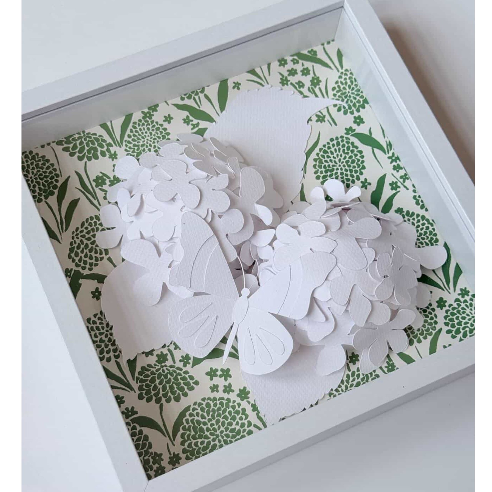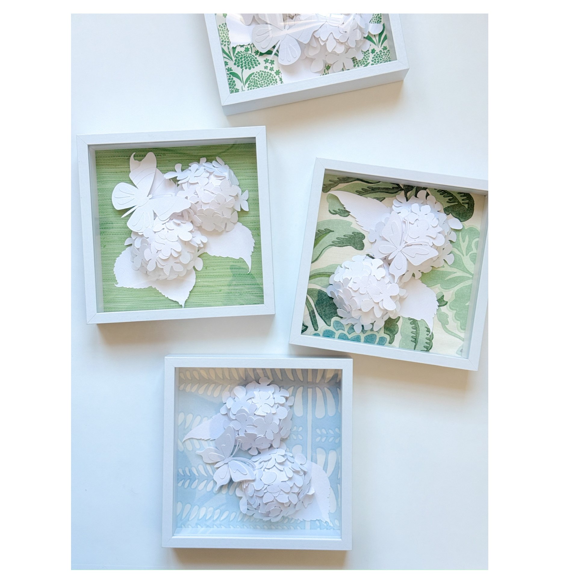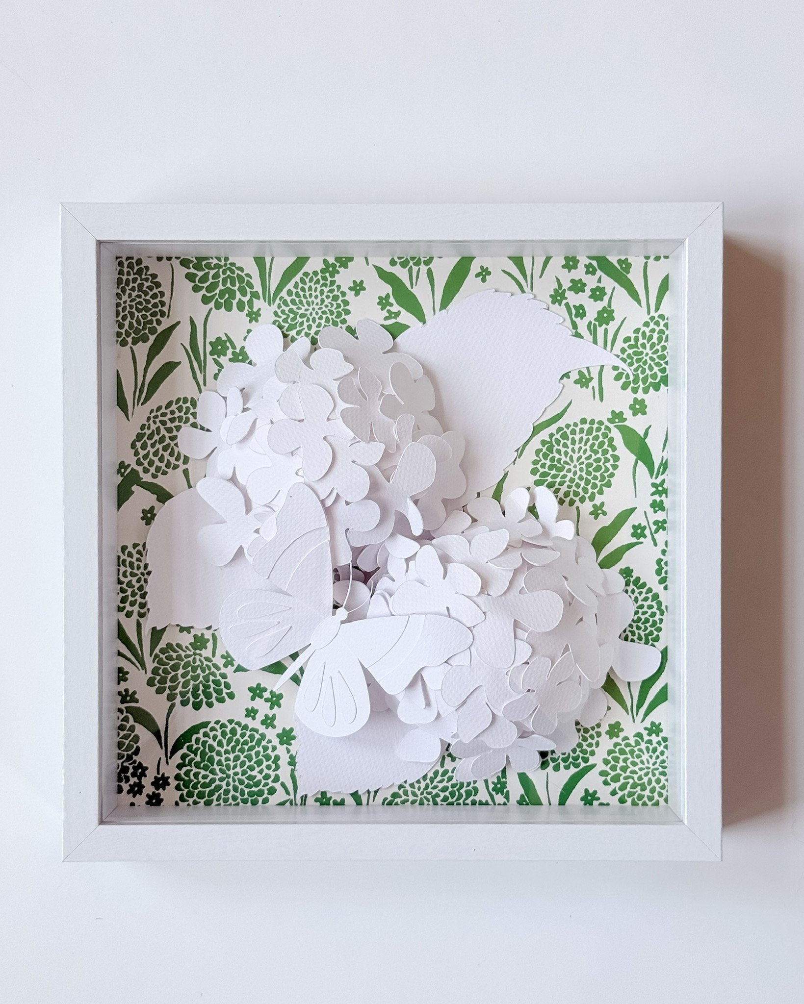 Hand-cut paper hydrangeas layered in shadow boxes over wallpaper backgrounds. Shadowbox can be displayed tabletop or hang.