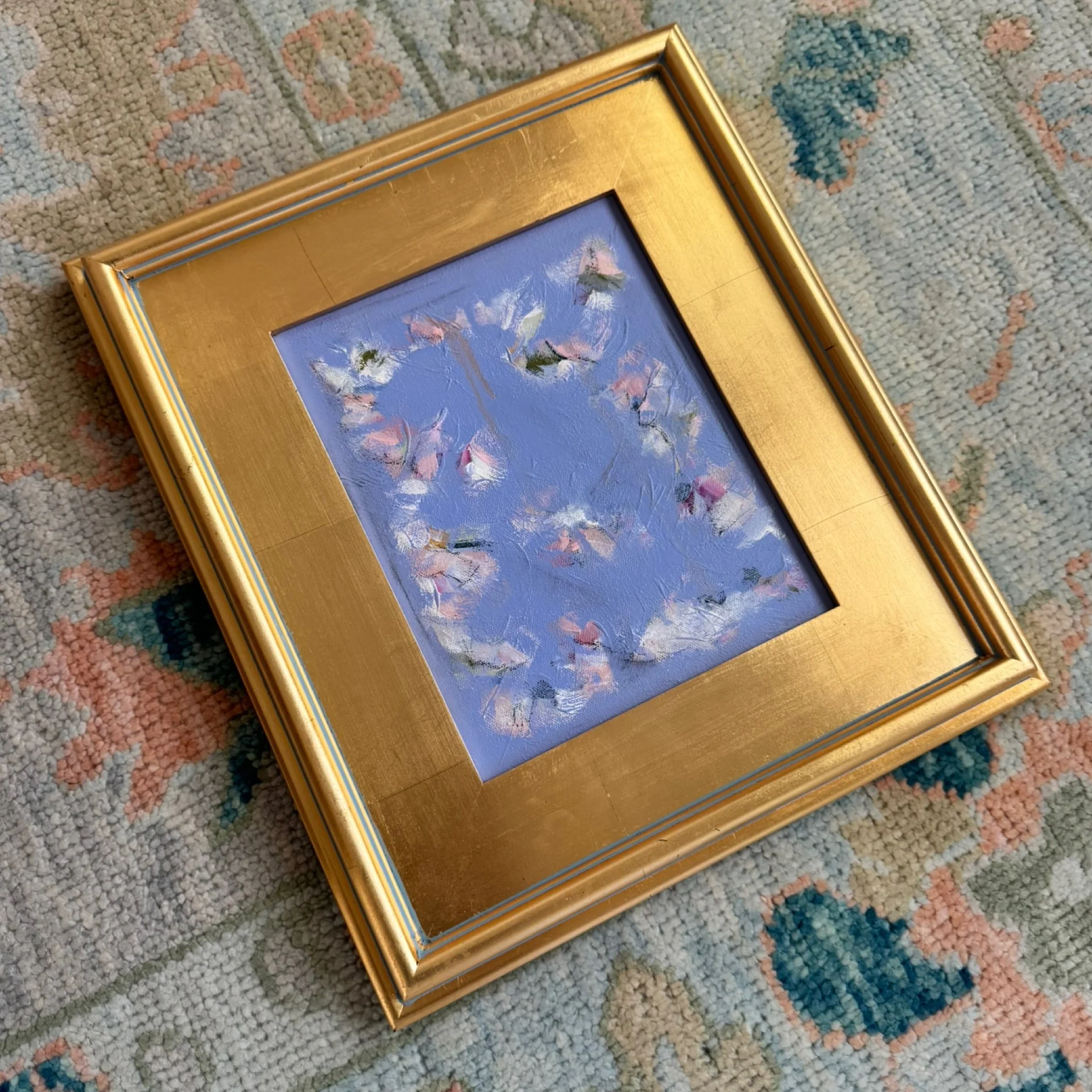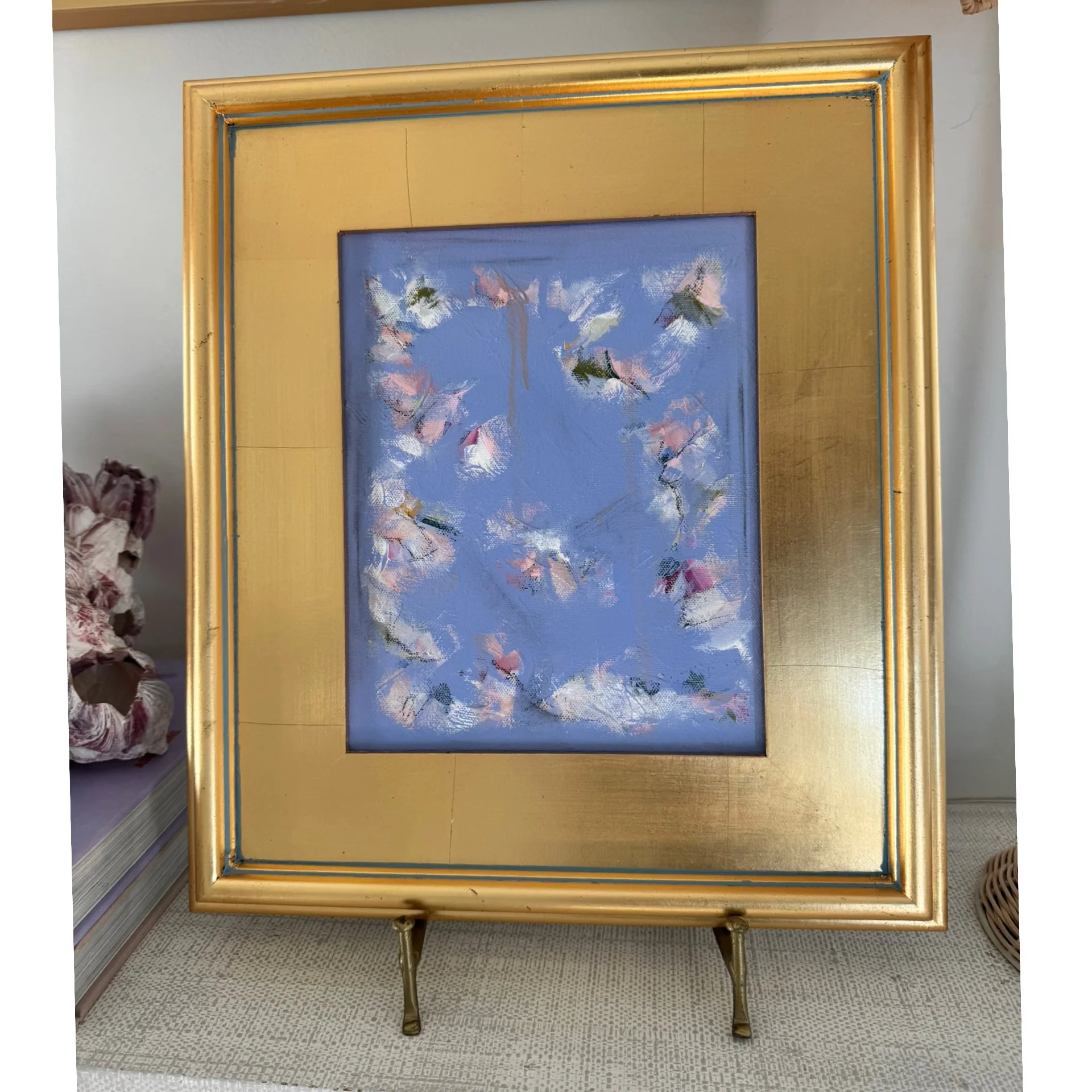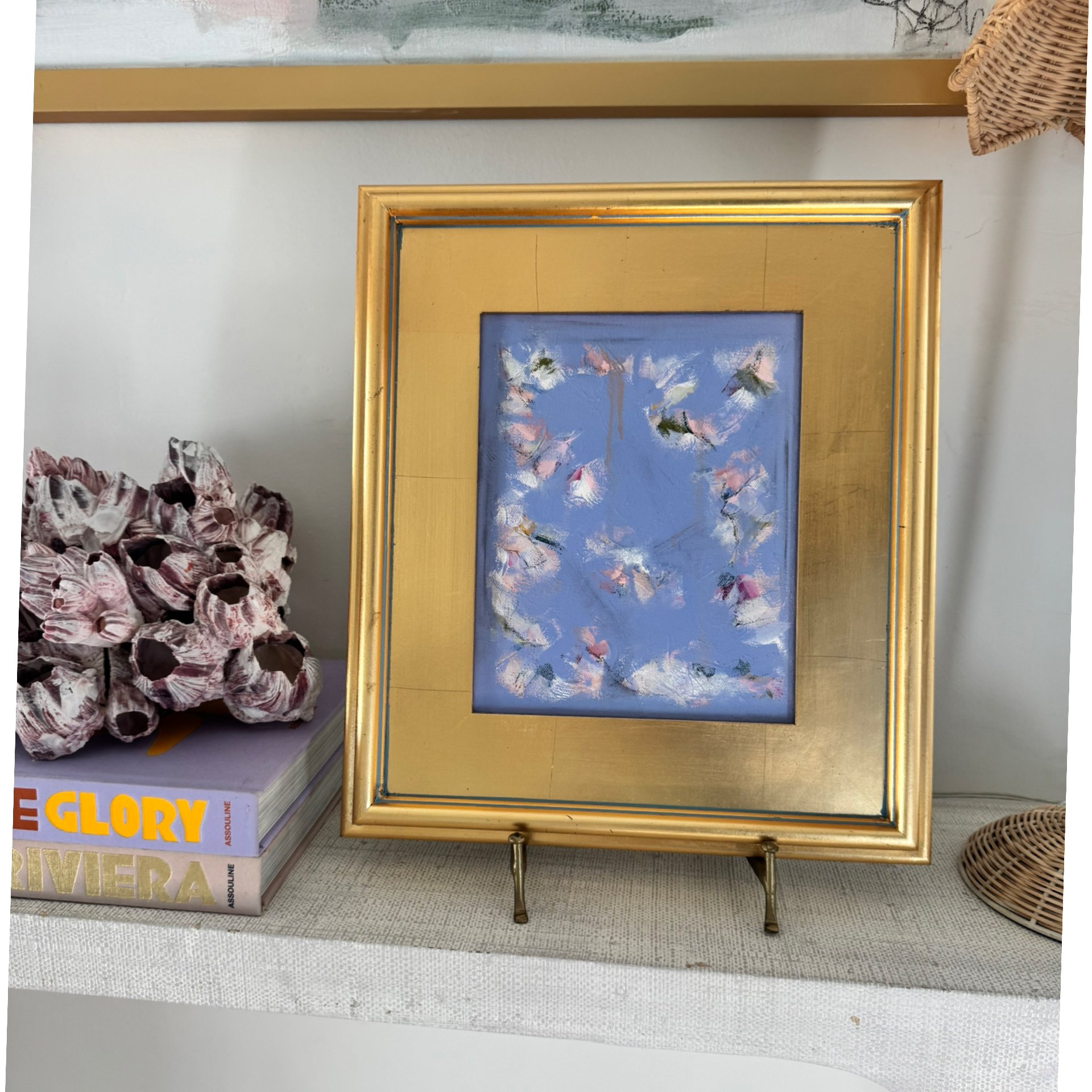 Mixed media on canvas, framed in a gold leaf frame.