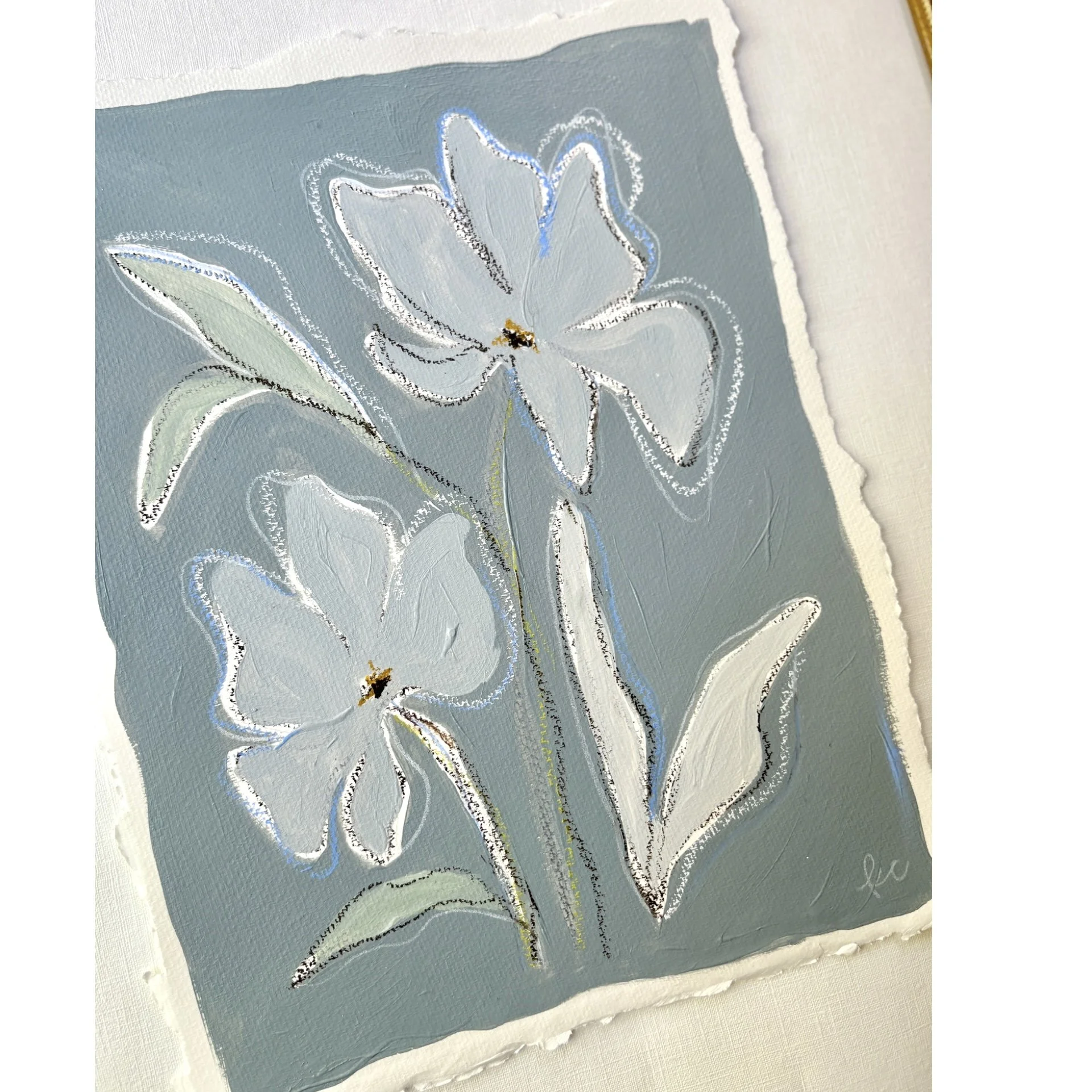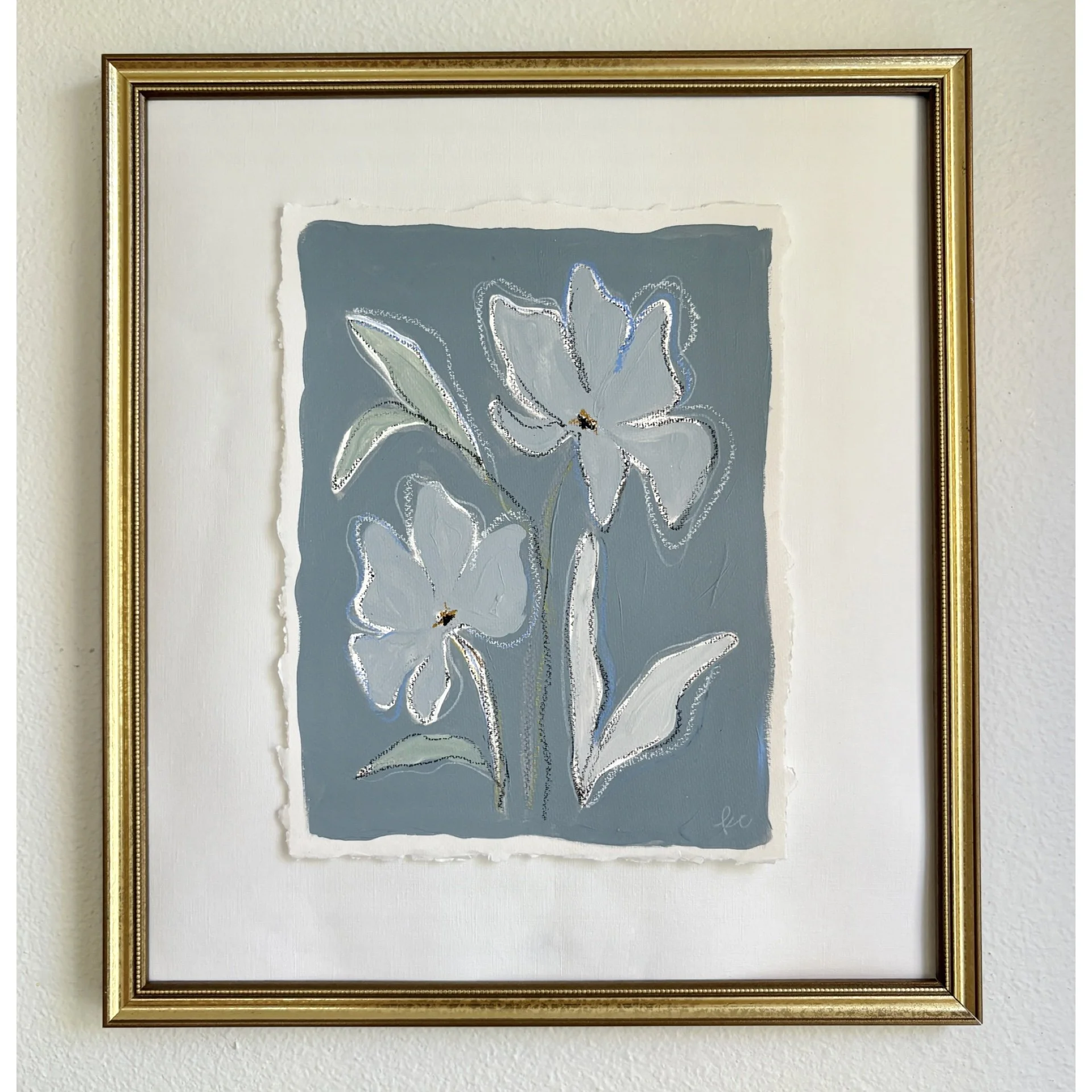 Original artwork on 10 x 13 inch hand torn paper. Floating in a gold wooden frame.