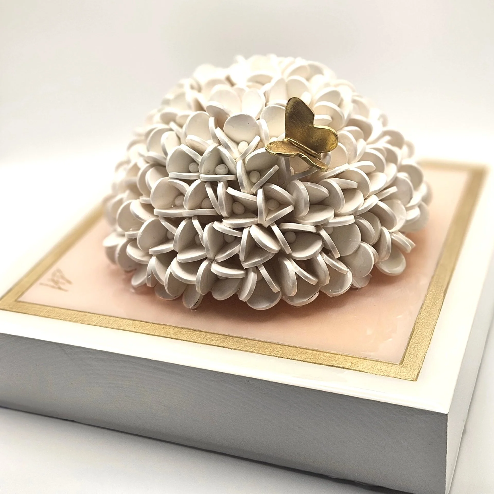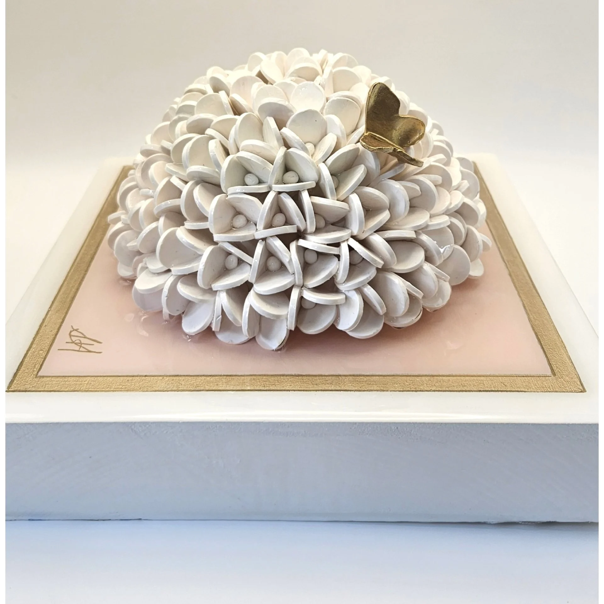 White hydrangea blossom on white ground. The blossom is nestled on a pale pink insert bordered with guilded edging. Wall hang hardware included.