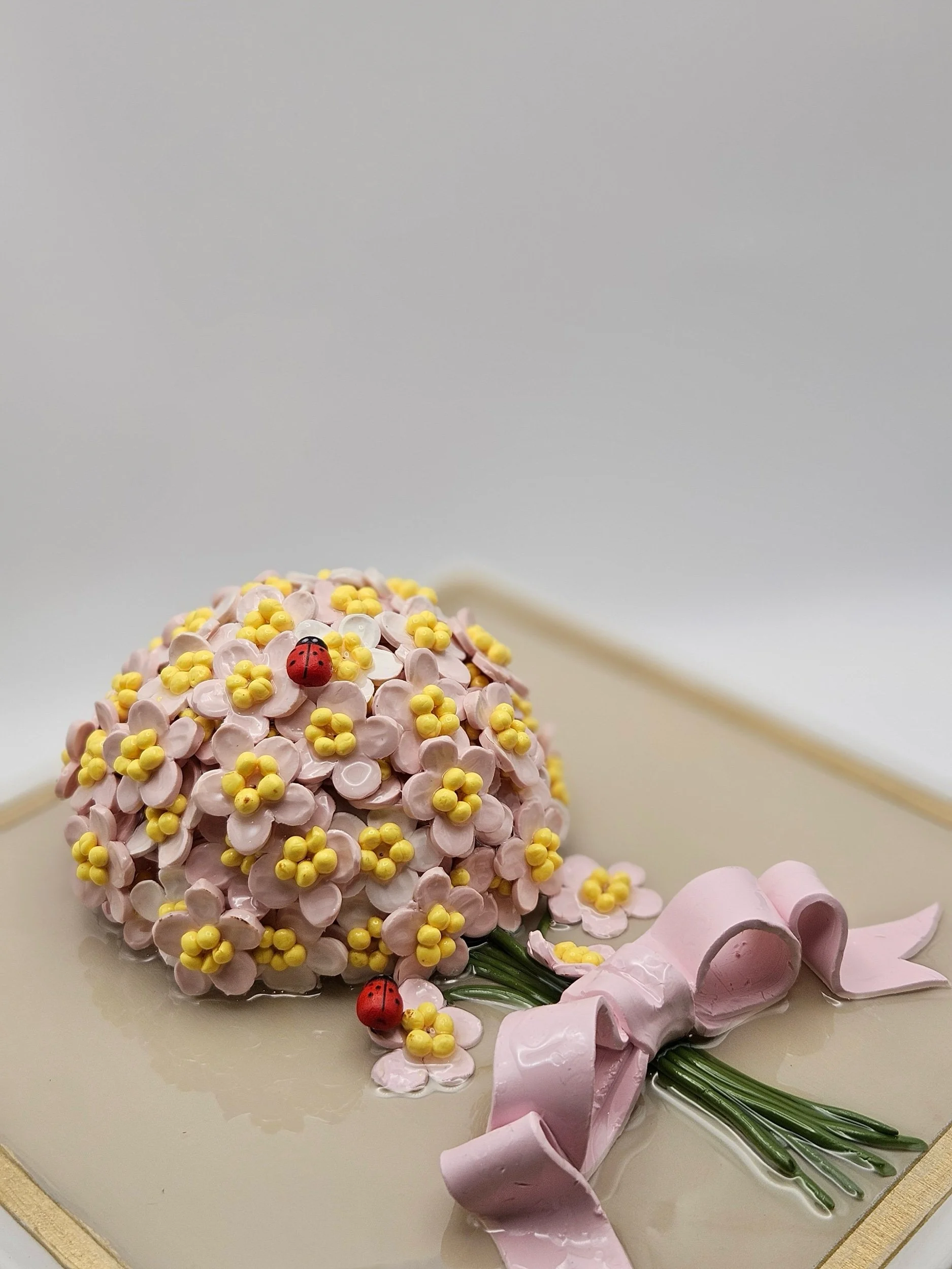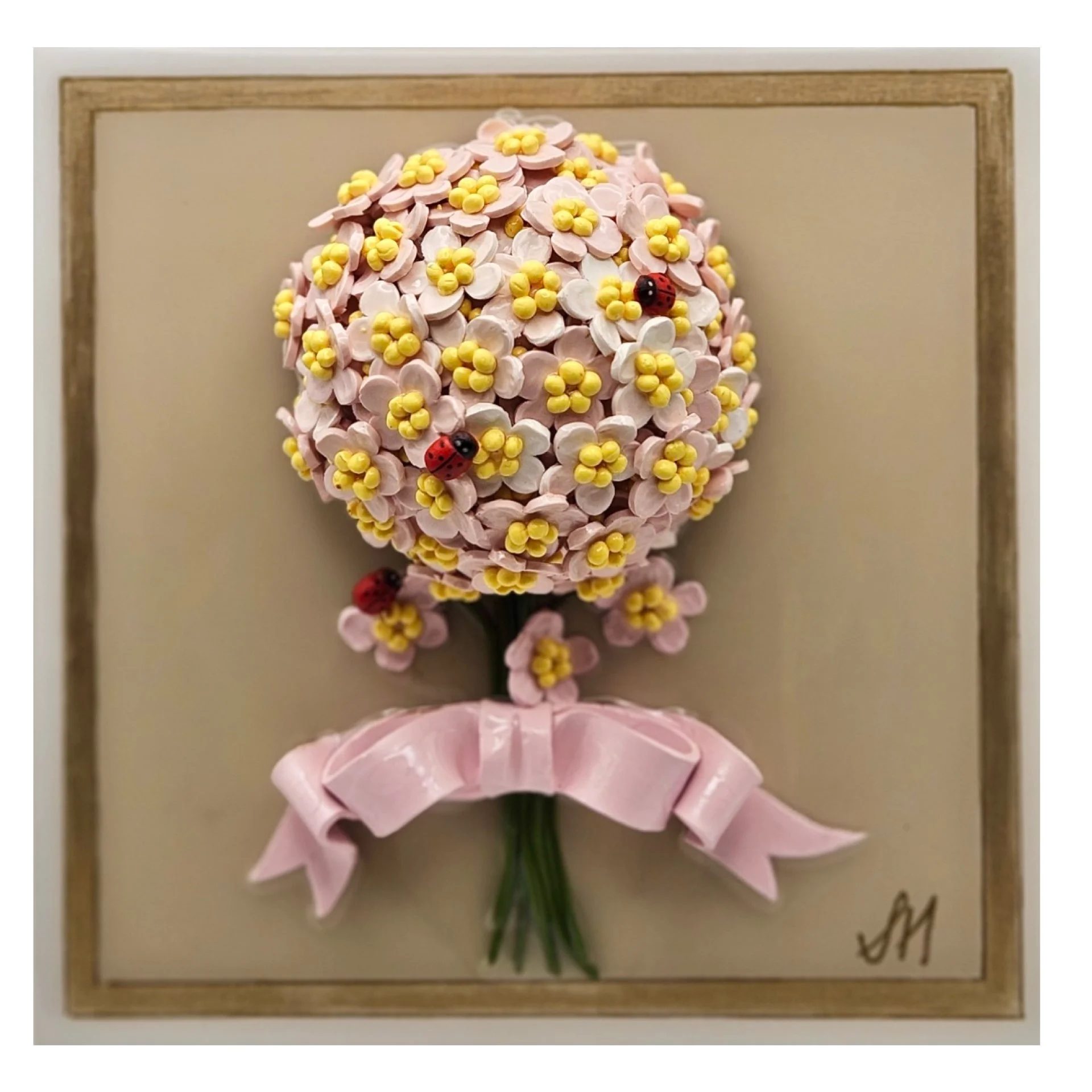 Pink posy with a pink bow and visiting ladybugs.