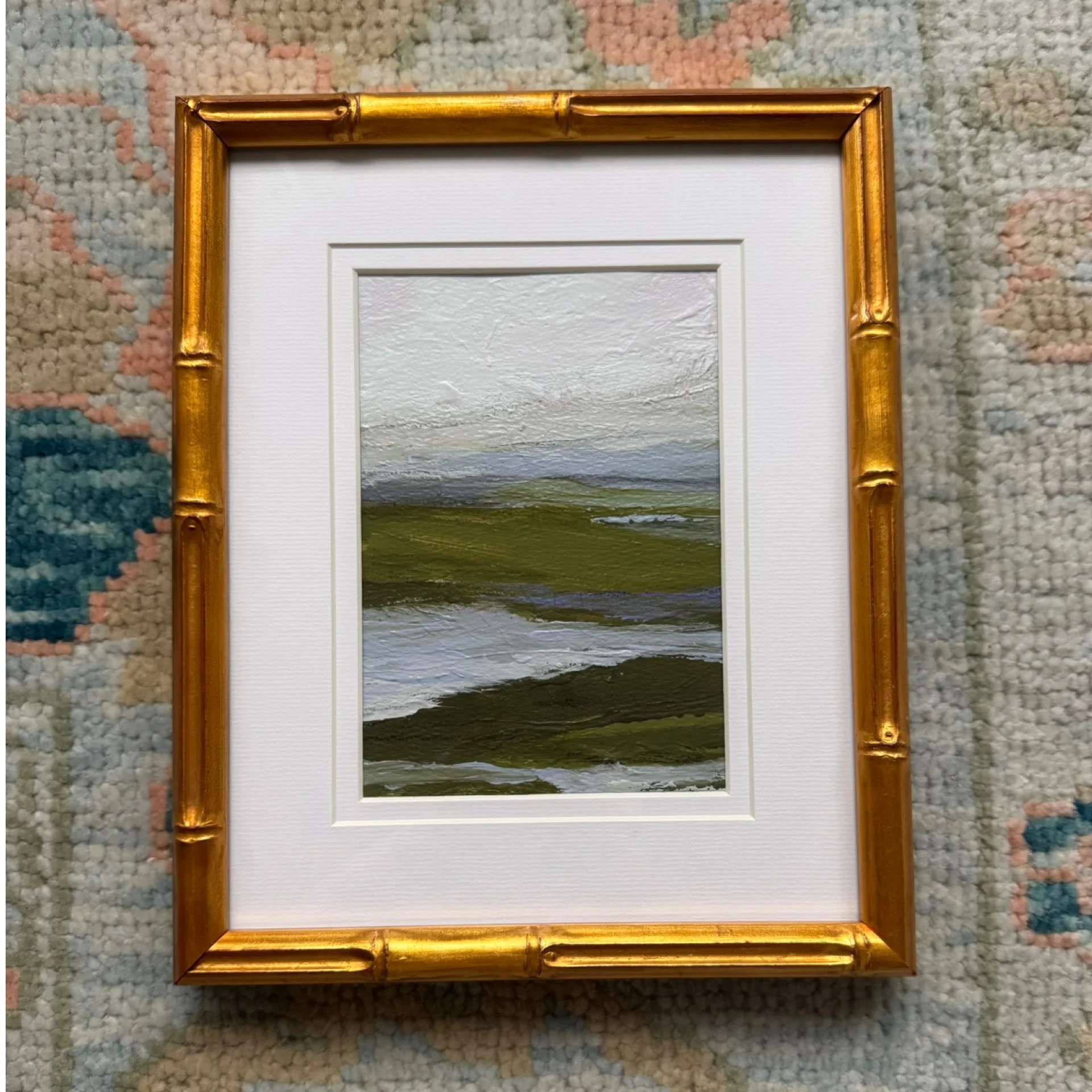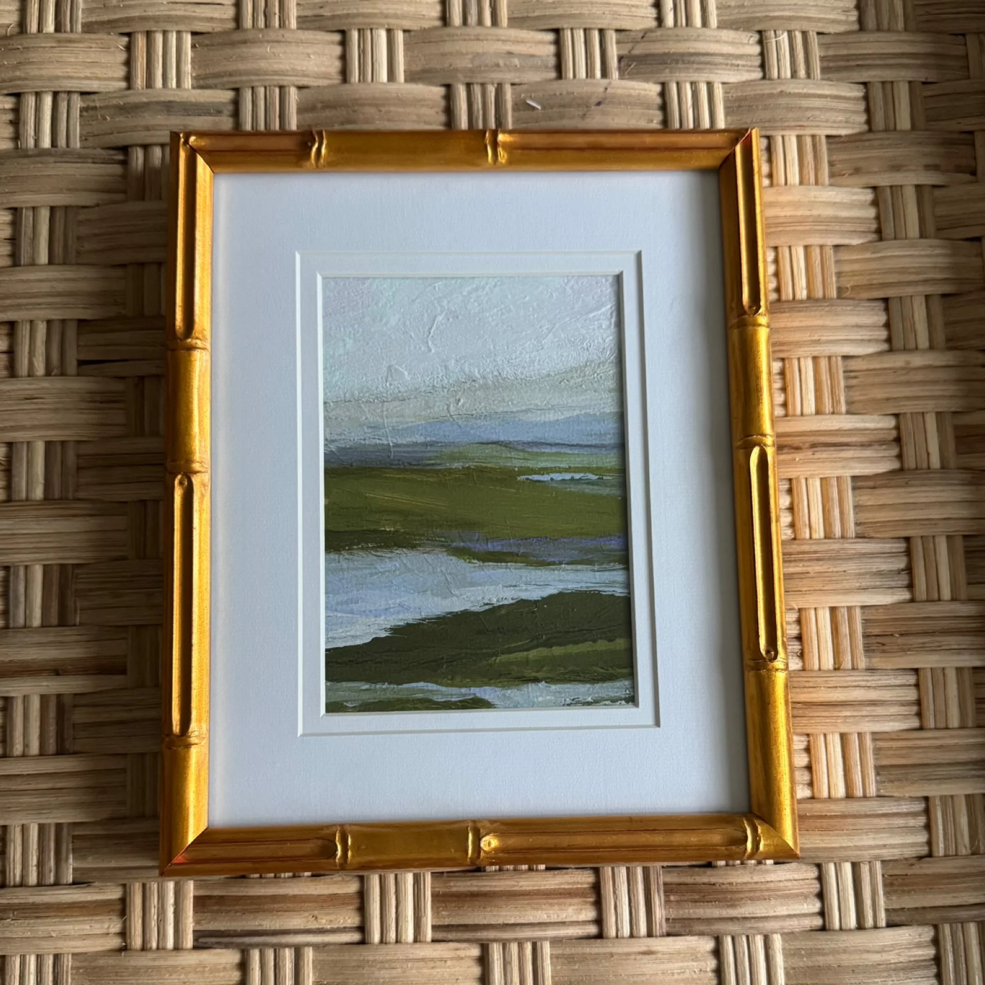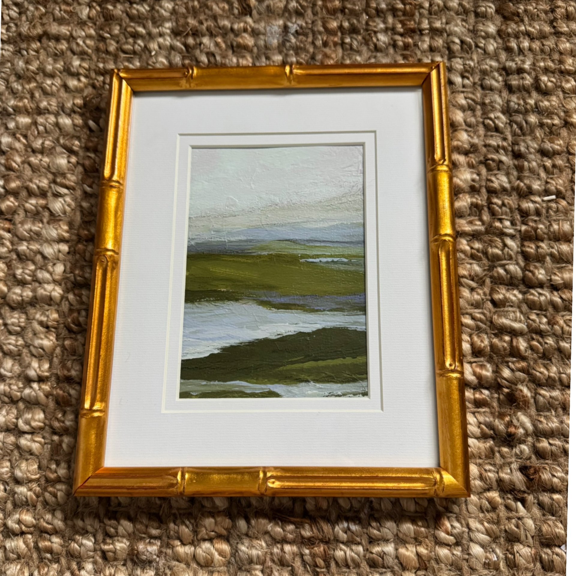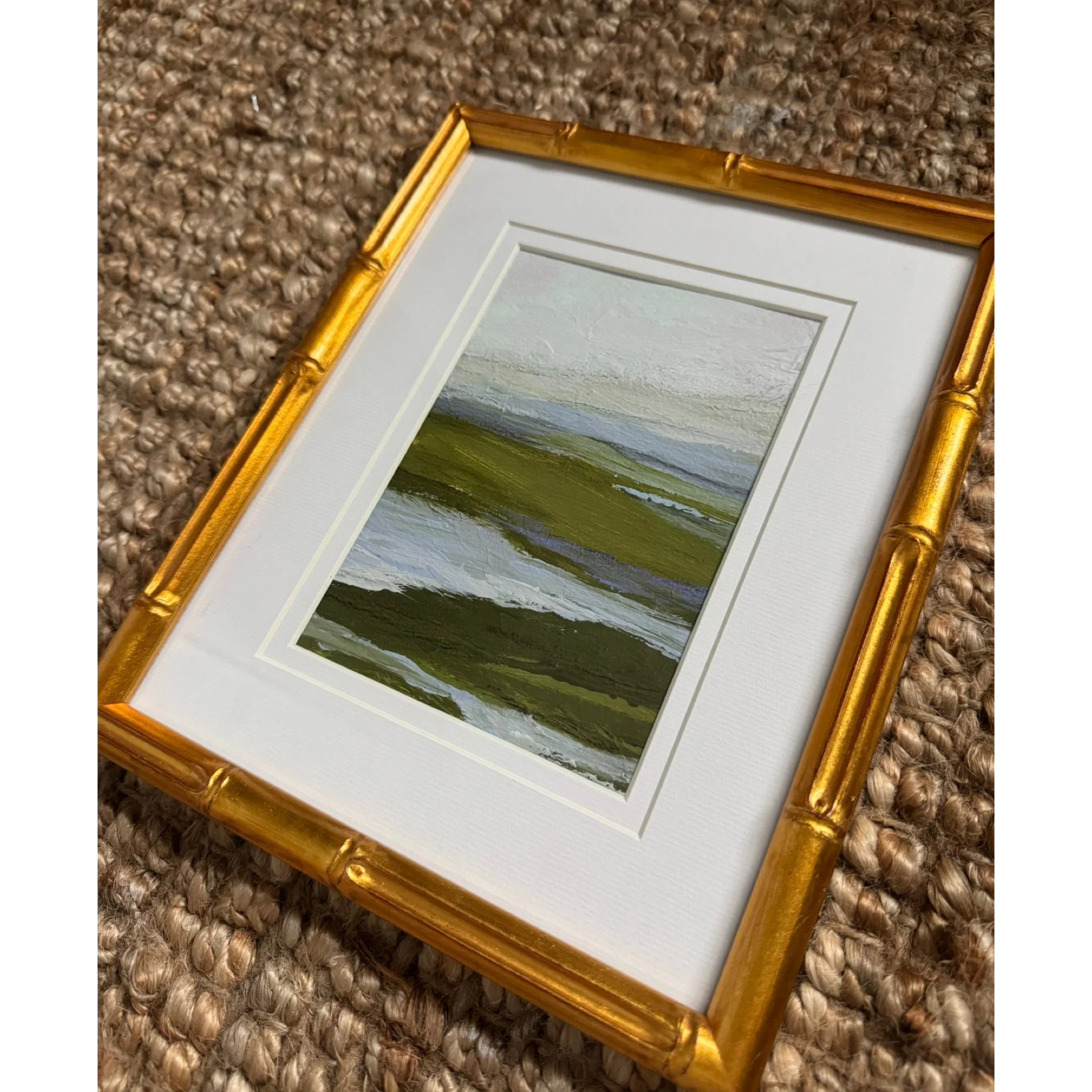 Mixed media on fine art paper, framed in gold bamboo with a glass front.