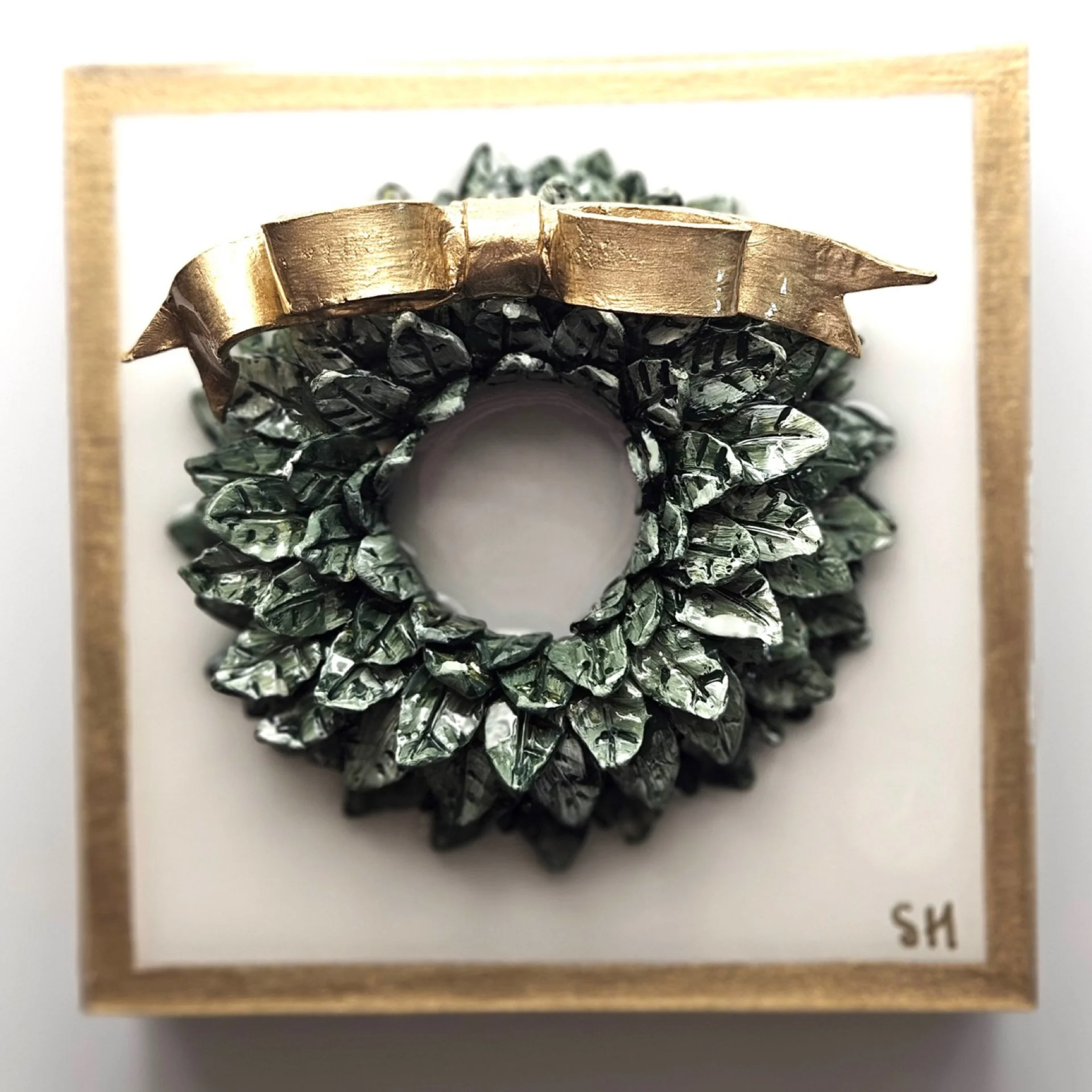 Handmade clay wreath with guilded bow on white ground with guilded edging and sides. Wall hang hardware installed.