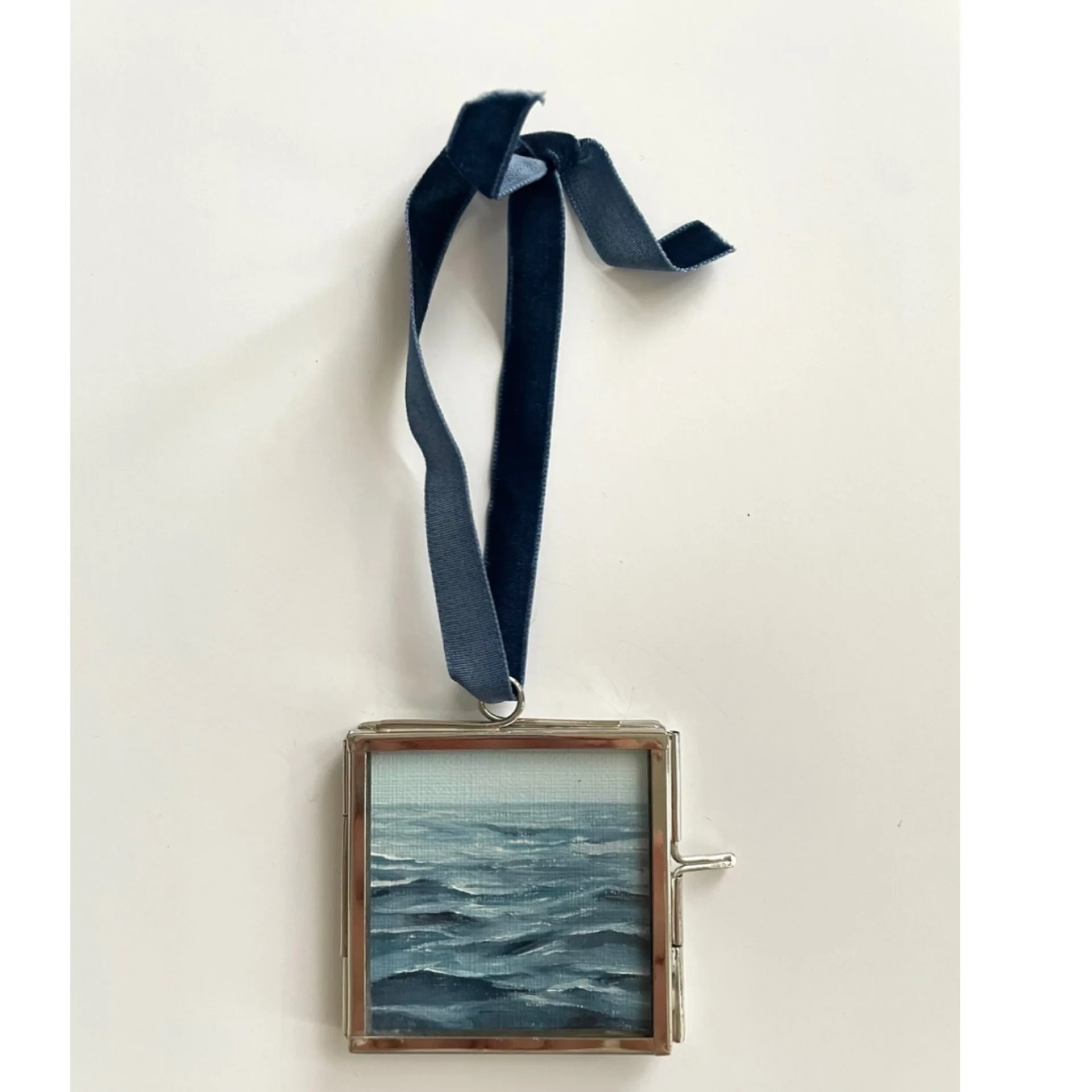 Original oil painting on fine art paper, signed on back, framed, and finished with a velvet ribbon.