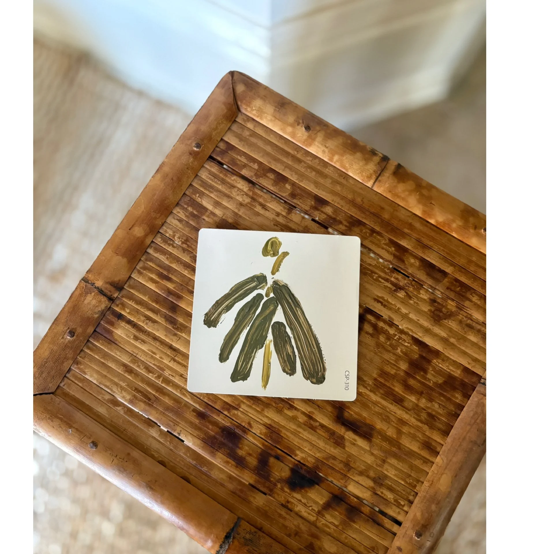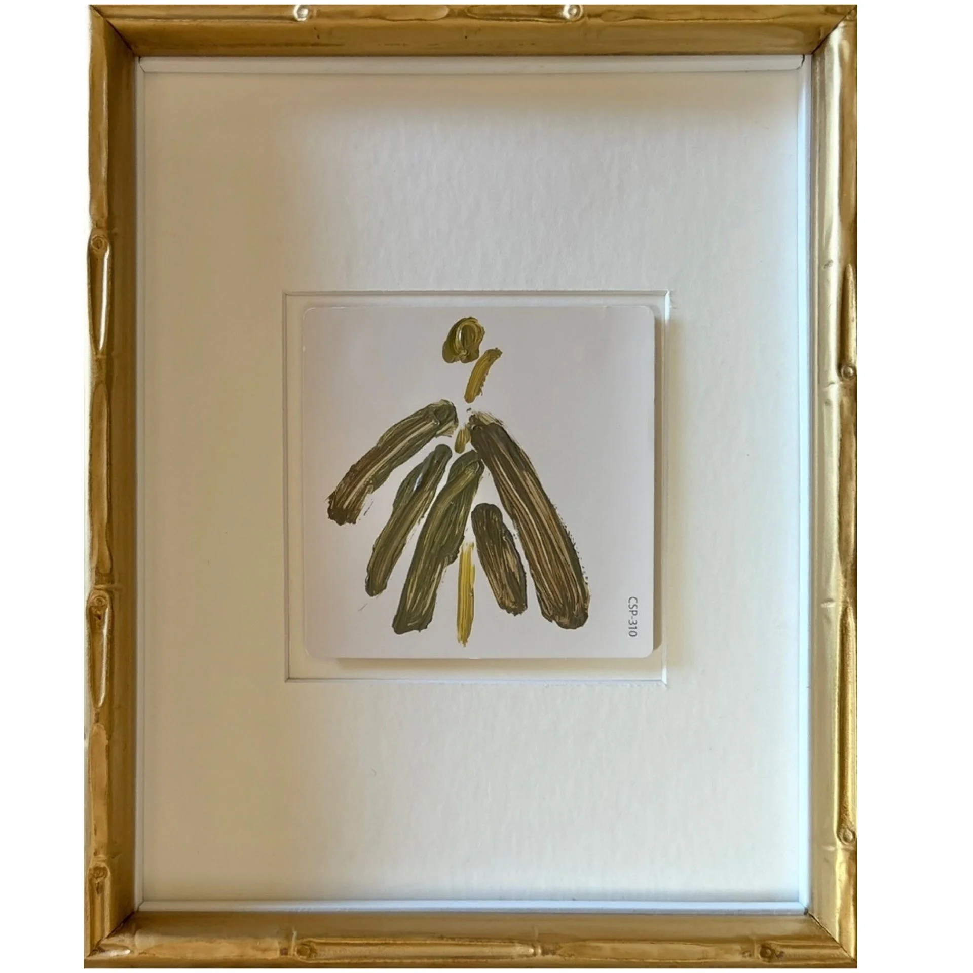 A whimsical abstract Southern botanical painted on a Benjamin Moore paint chip (First Crush), set in a gold bamboo-style frame with custom matting.
