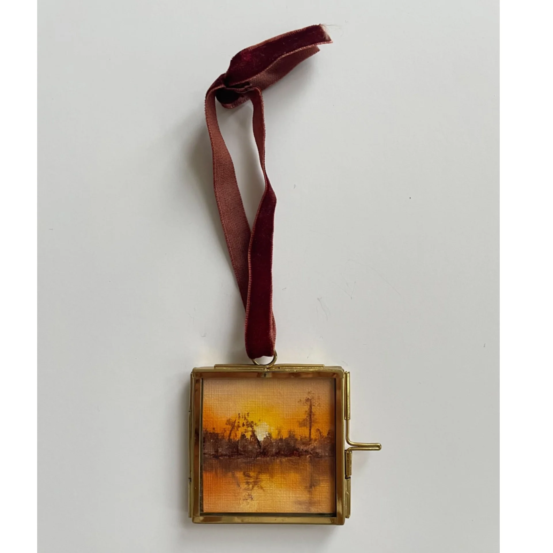 Original oil painting on fine art paper, signed on back, framed, and finished with a velvet ribbon.
