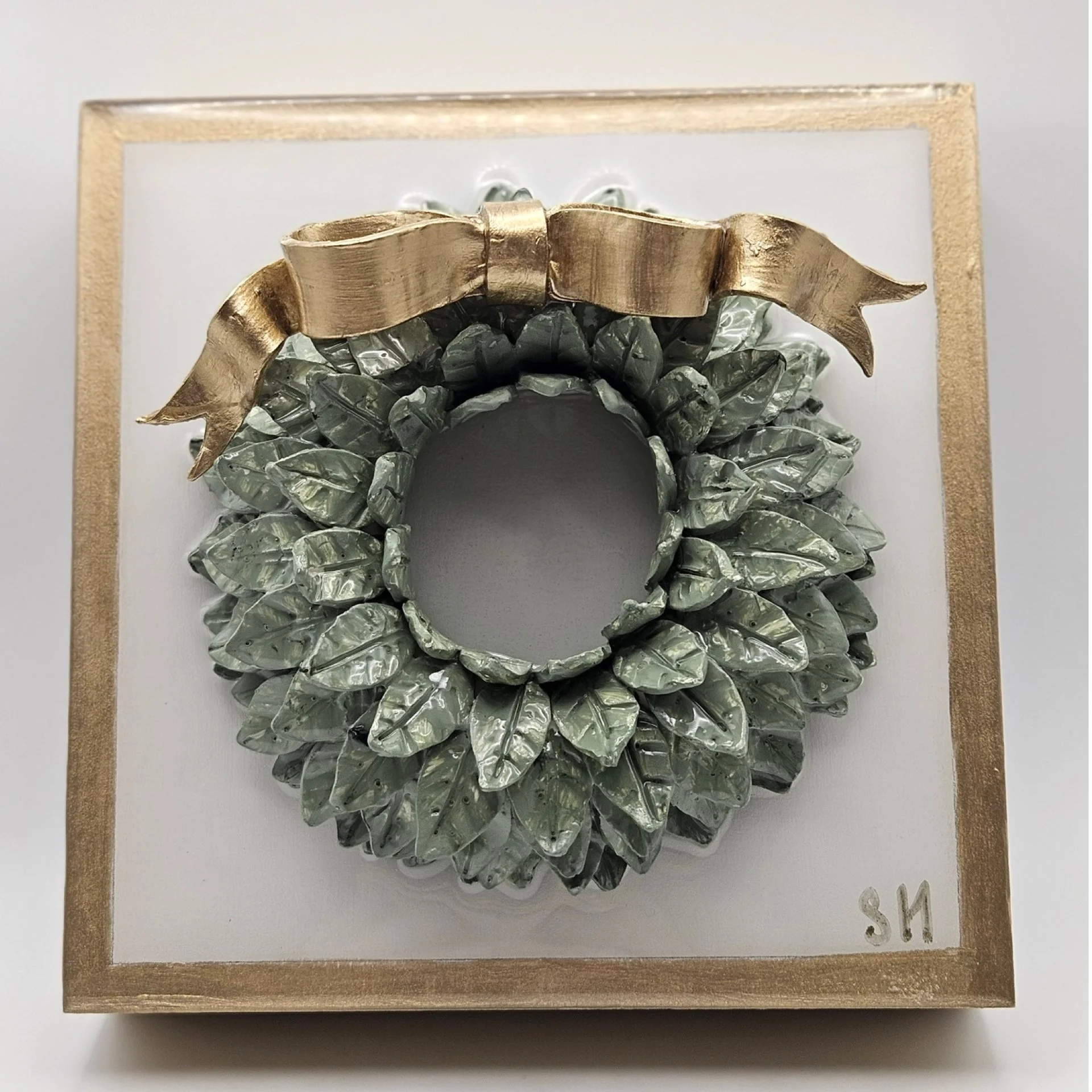 Handmade clay wreath with guilded bow on white ground with guilded edging and sides. Wall hang hardware installed.