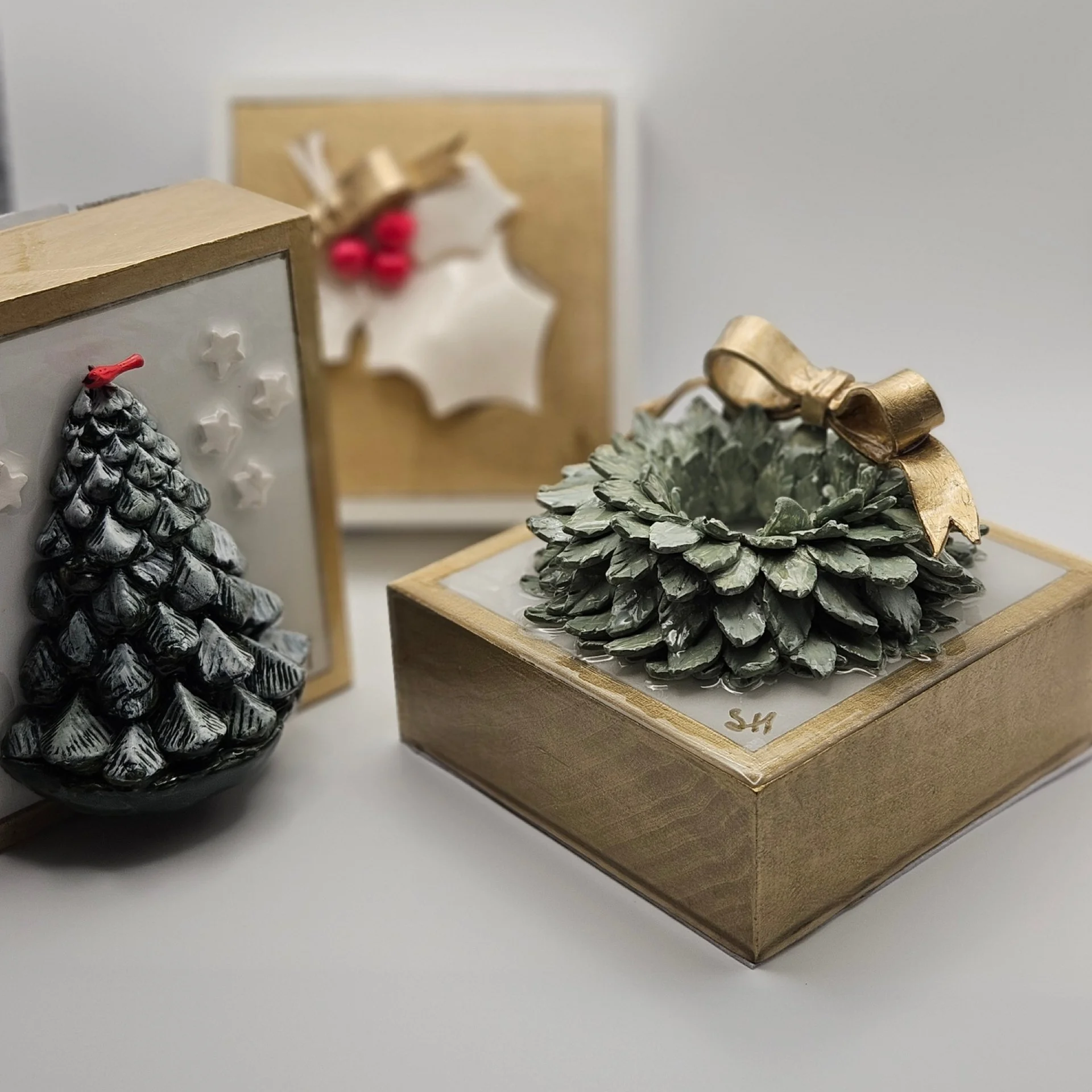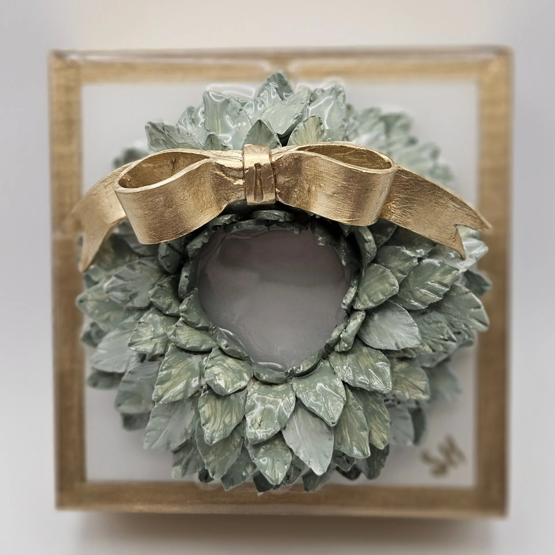 Handmade clay wreath with guilded bow on white ground with guilded edging and sides. Wall hang hardware installed.