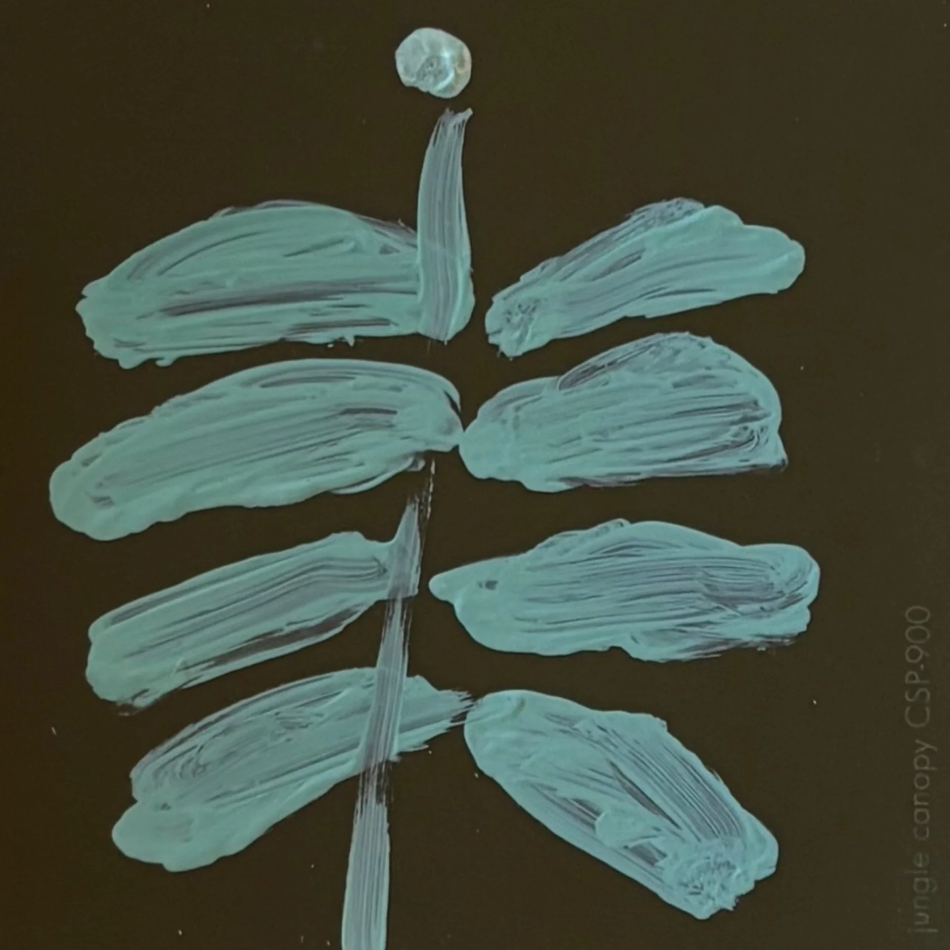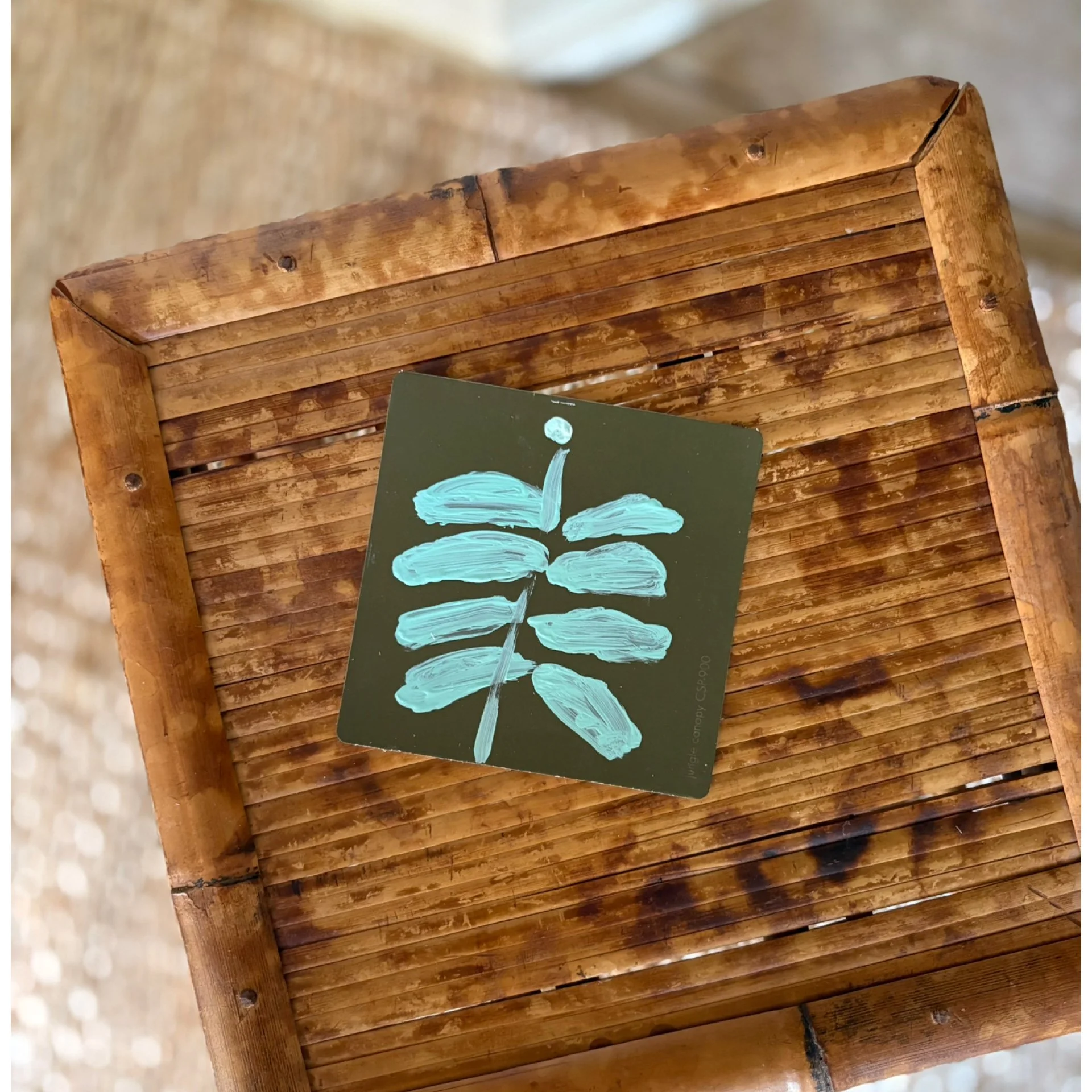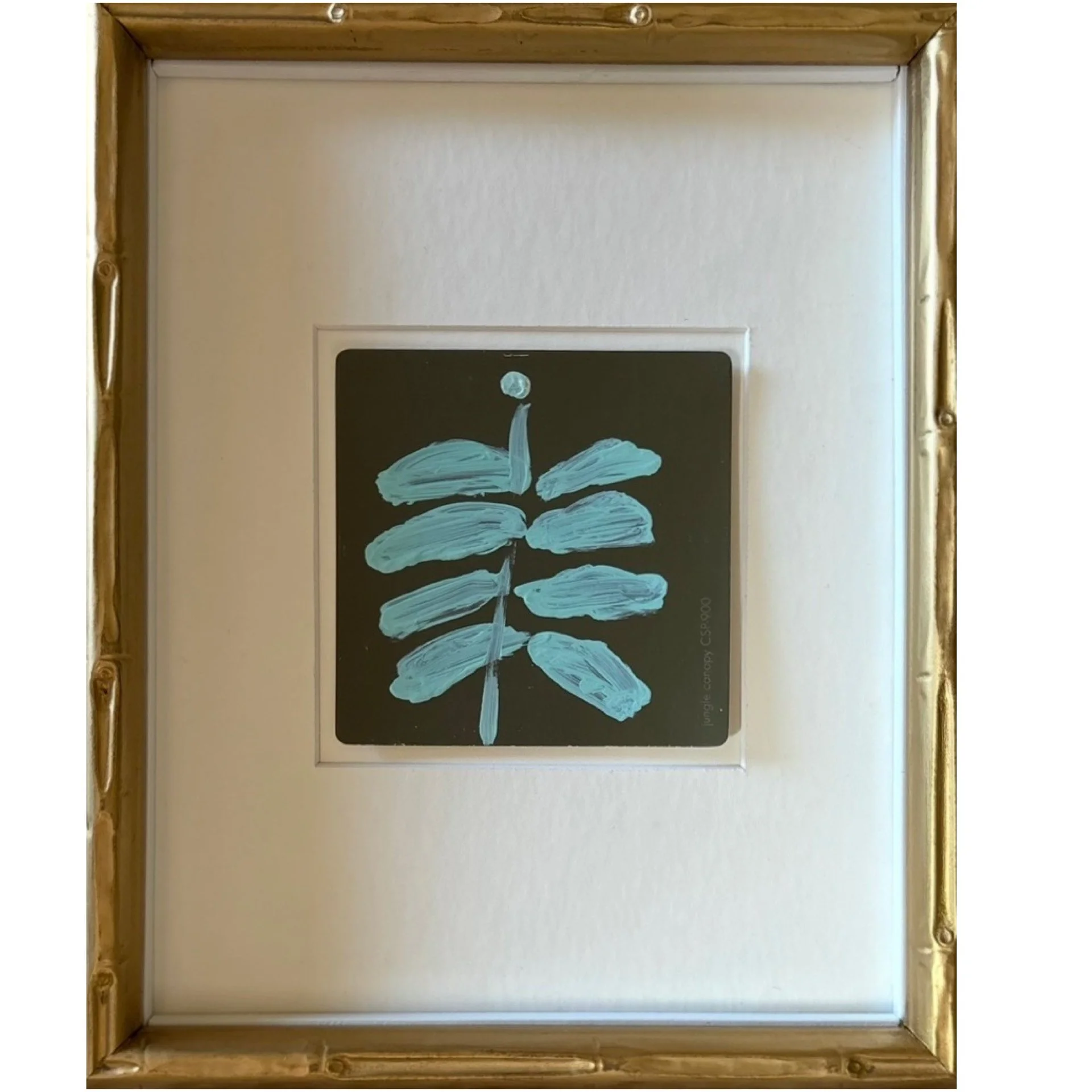 A whimsical abstract Southern botanical painted on a Benjamin Moore paint chip (Jungle Canopy), set in a gold bamboo-style frame with custom matting.