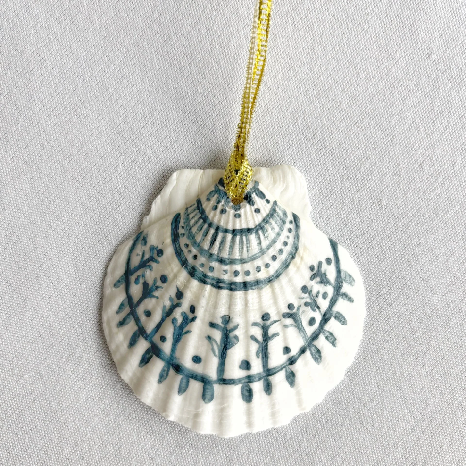 Hand painted shell ornament with gold ribbon