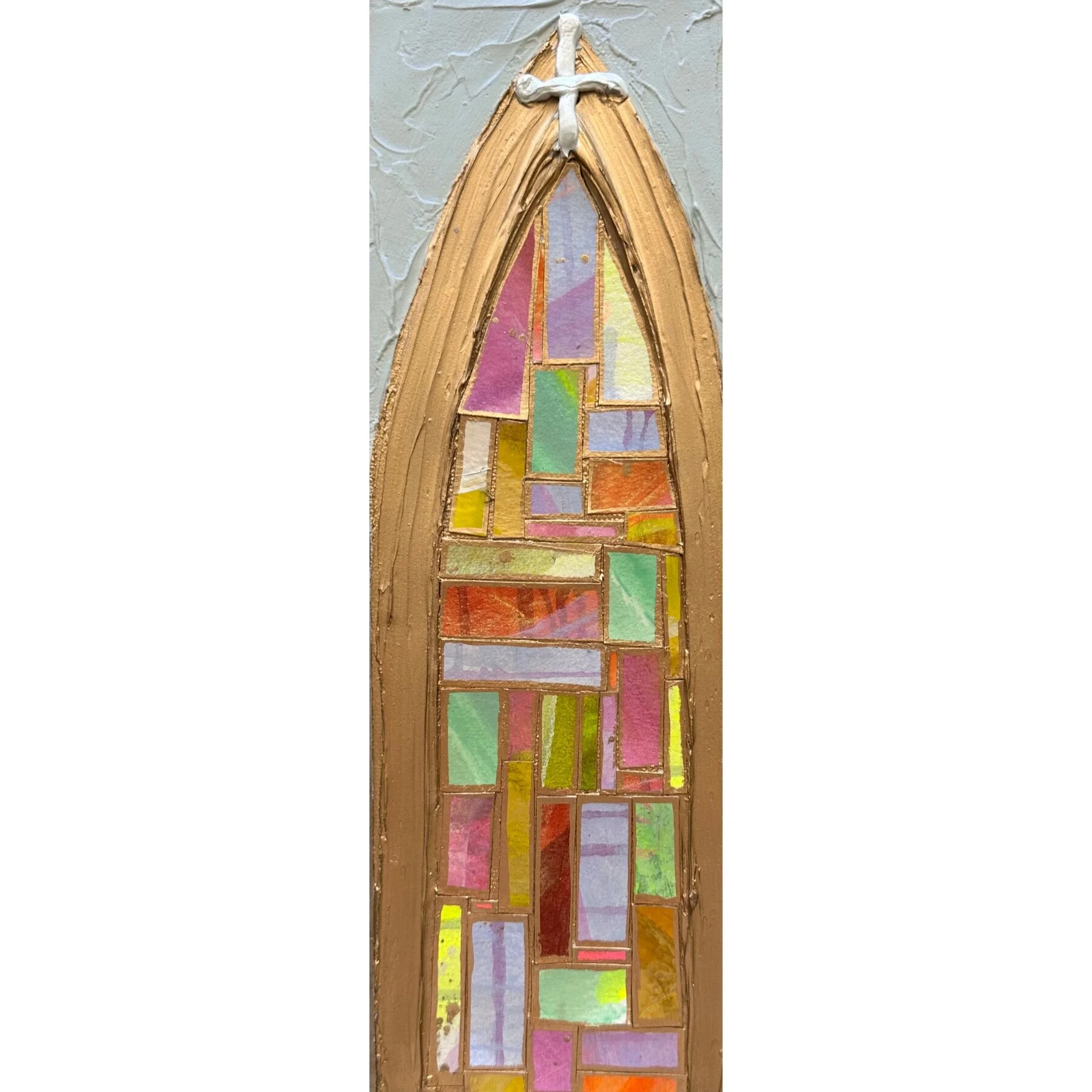 Hand Painted Collage with Hand Dyed Papers mixed with Papers Imported from Israel and Italy on Canvas. A Heavy Coat of Resin Seals It.