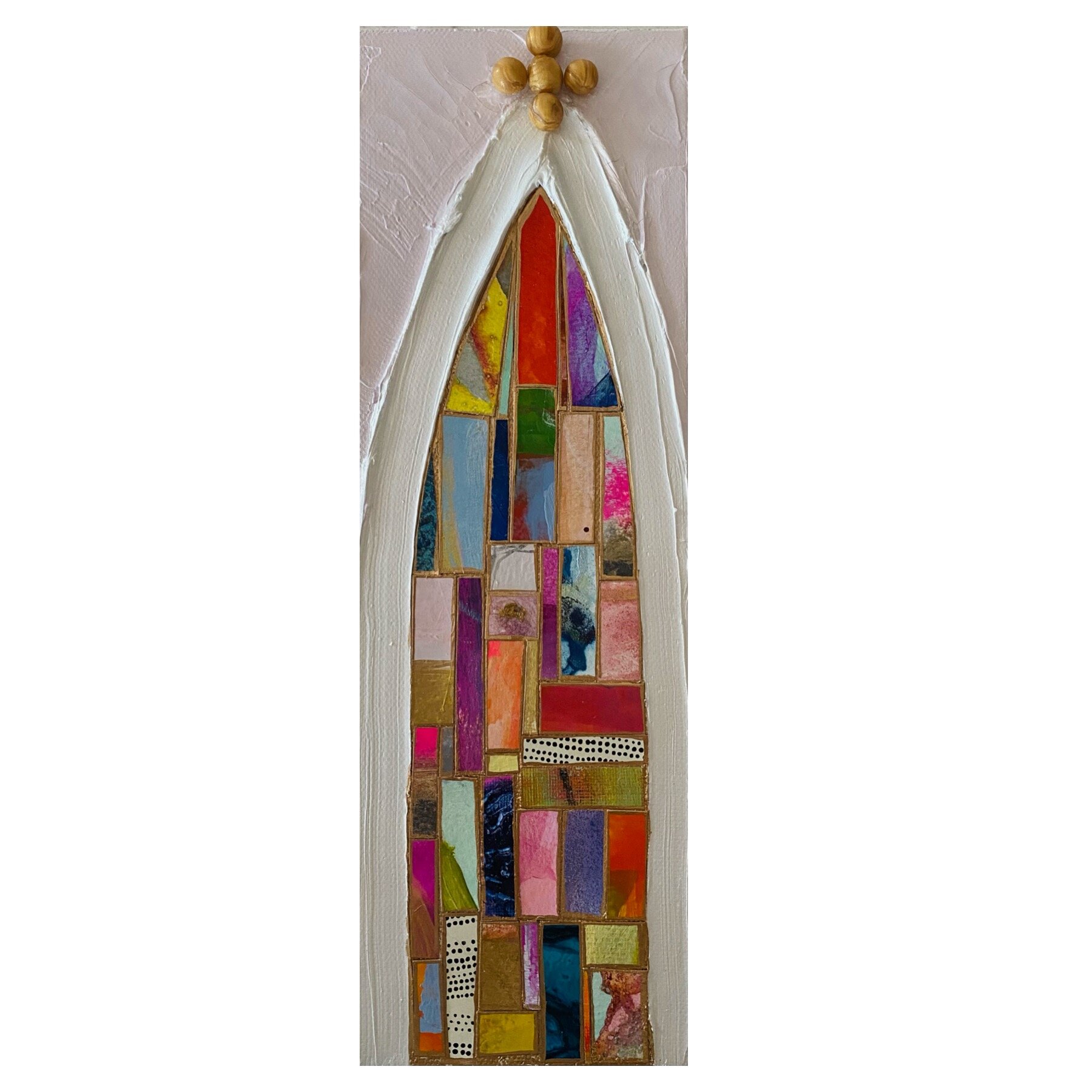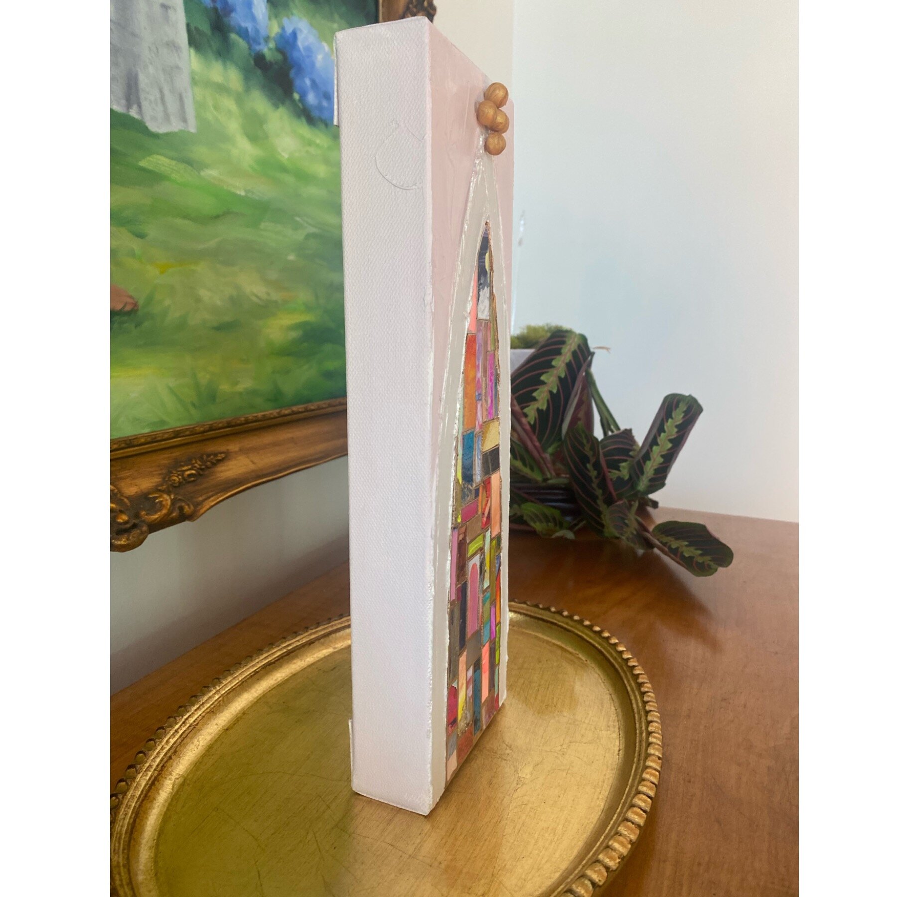Hand Painted Collage with Hand Dyed Papers Mixed With Papers Imported from Italy and Israel on Canvas 2 inches thick. A Heavy Coat of Resin Seals It. Can Hang or Stand.