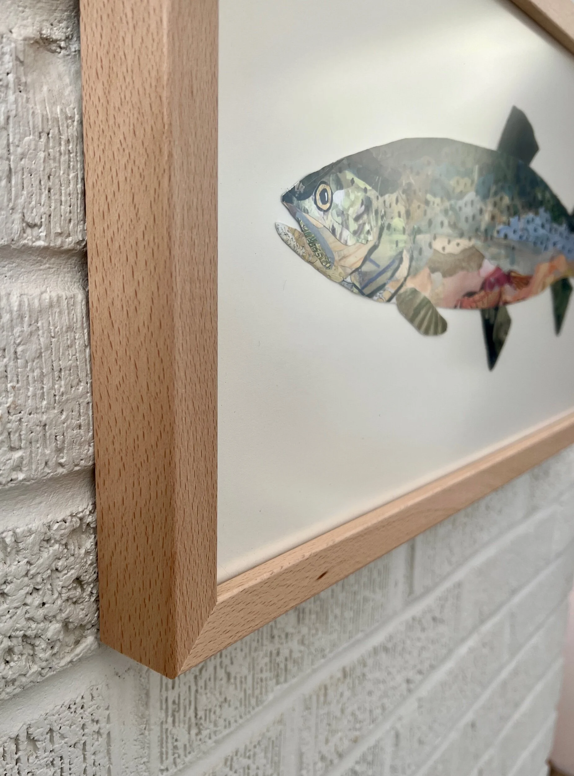 Mixed Media Collage, Custom Framed in European Beech. Frame depth is 1.5 Inches. Art is Sealed With Varnish and Mounted Under Non-Glare Acrylic. Wired and Ready To Hang.