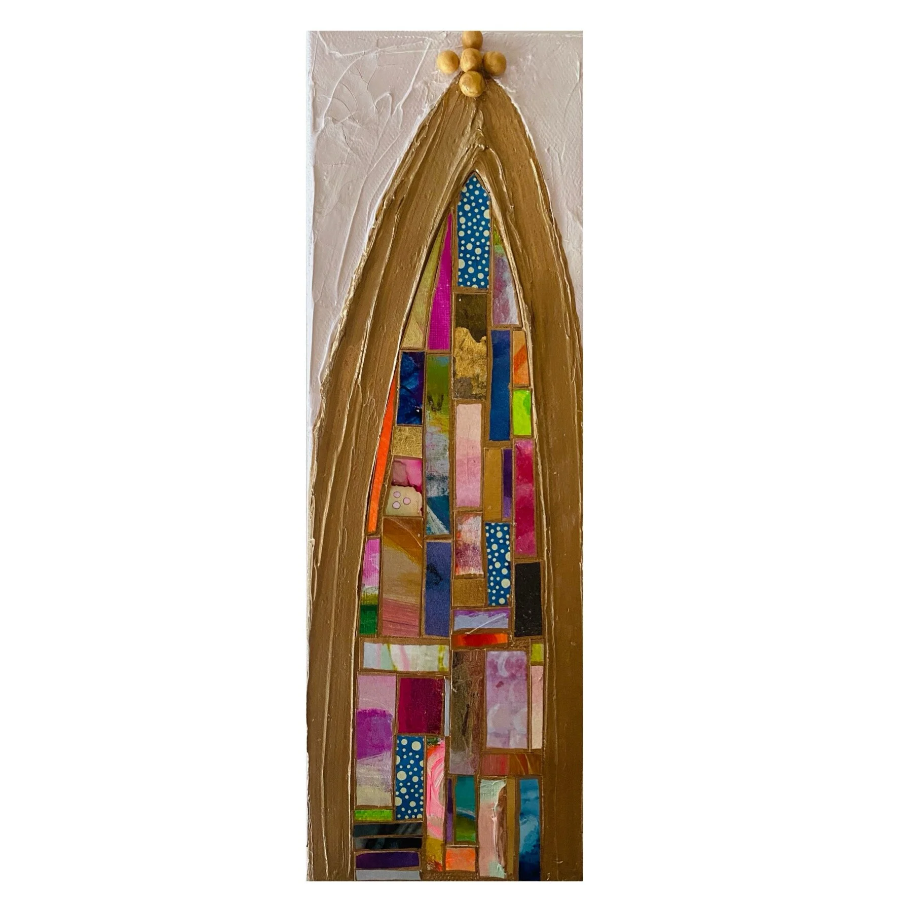 Hand Painted Collage with Hand Dyed Papers Mixed With Papers Imported from Italy and Israel on Canvas 2 inches thick. A Heavy Coat of Resin Seals It. Can Hang or Stand.