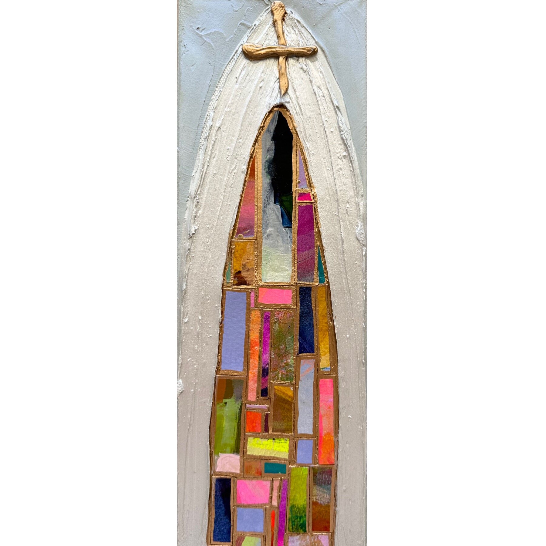 Hand Painted Collage with Hand Dyed Papers mixed with Papers Imported from Israel and Italy on Canvas. A Heavy Coat of Resin Seals It.