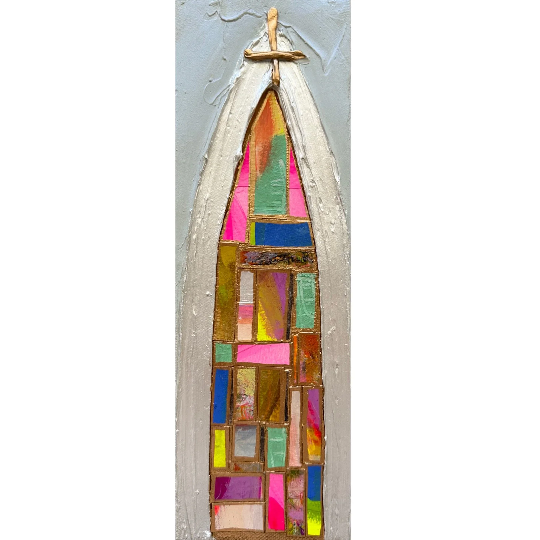 Hand Painted Collage with Hand Dyed Papers mixed with Papers Imported from Israel and Italy on Canvas. A Heavy Coat of Resin Seals It.