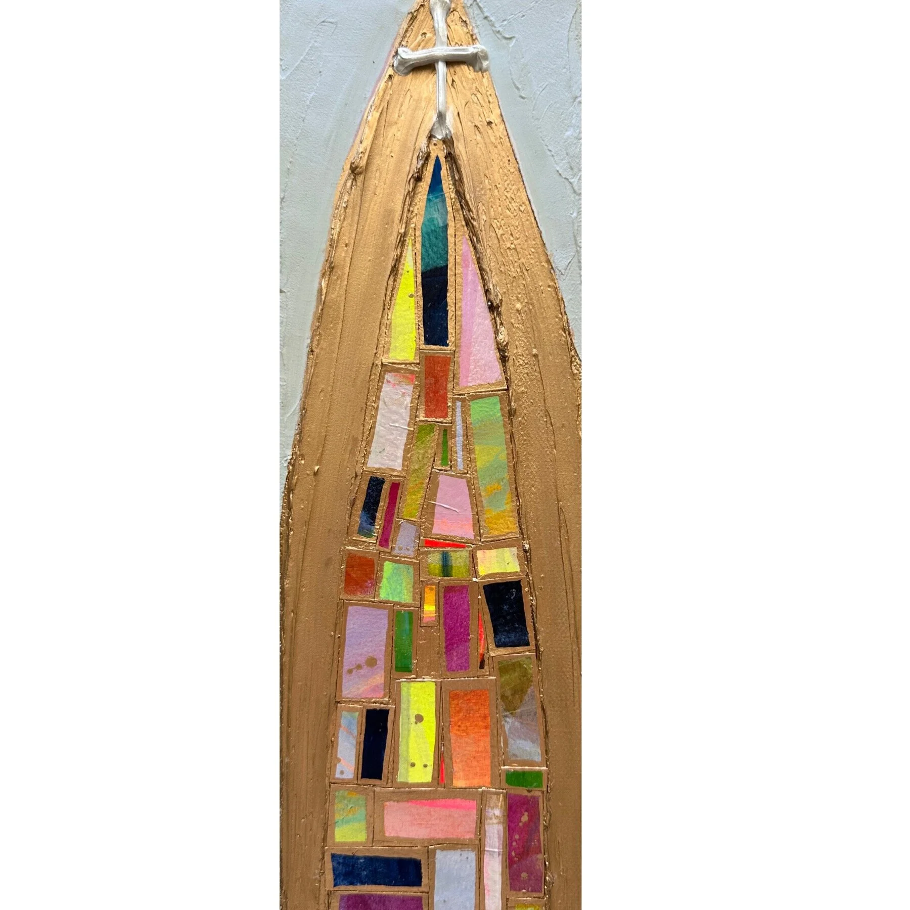 Hand Painted Collage with Hand Dyed Papers mixed with Papers Imported from Israel and Italy on Canvas. A Heavy Coat of Resin Seals It.